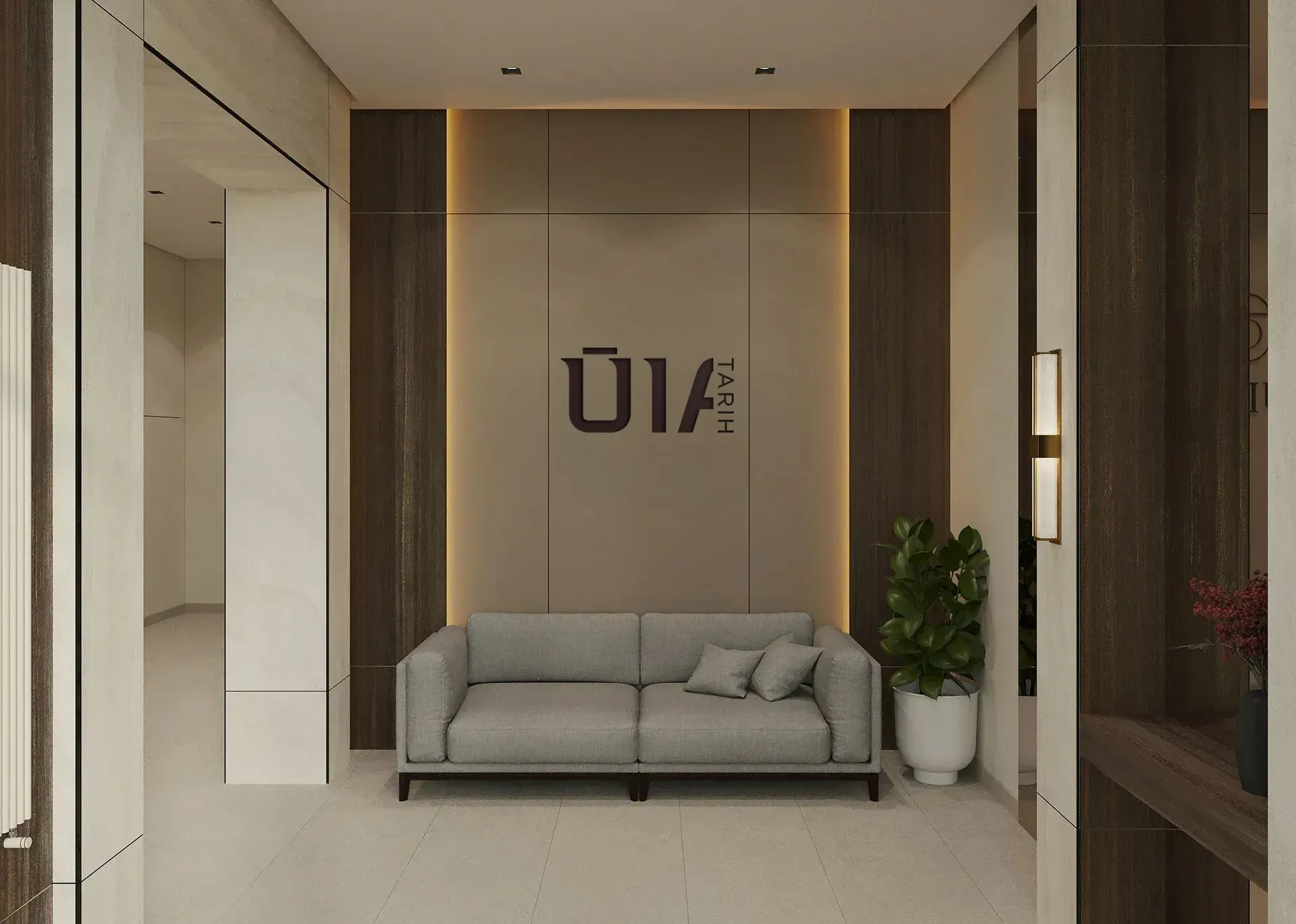 Холлы излучает атмосферу уюта и стиля. В мягкой зоне ожидания удобный диван, на котором можно отдохнуть в спокойной обстановке. Интерьер украшен современными элементами дизайна, создавая гармоничное и приятное пространство. Колясочная, расположенная рядом, выполнена с акцентом на практичность и удобство, обеспечивая комфорт для хранения колясок и другого детского инвентаря.
