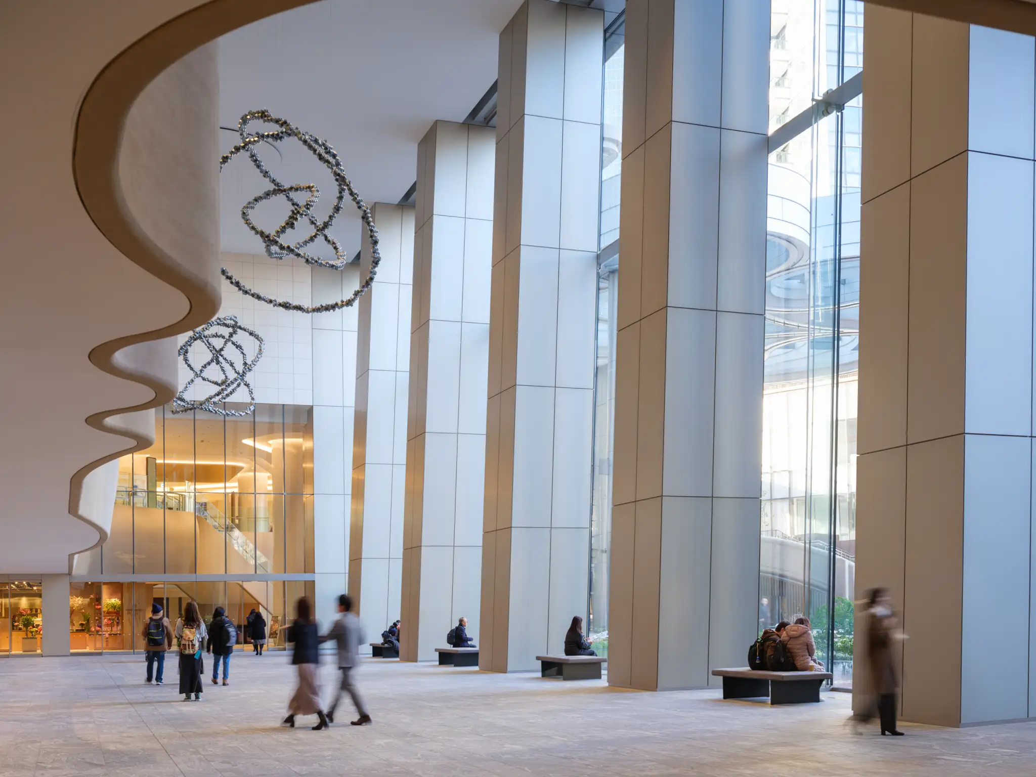 Внутри этой «зеленой волны» спрятан 700-метровый подземный променад («The Pulse»), соединяющий две станции метро и защищающий пешеходов от токийских дождей.