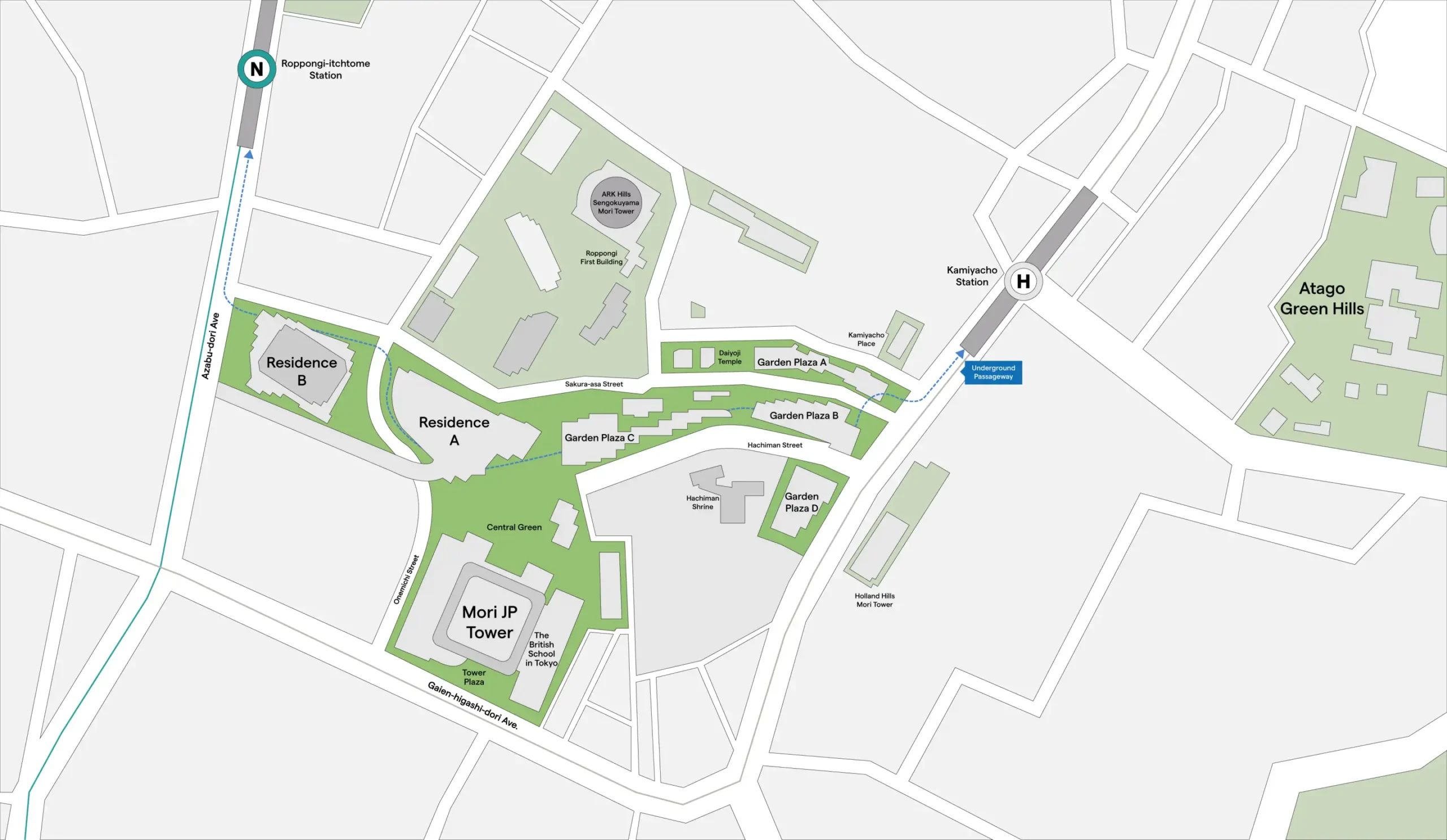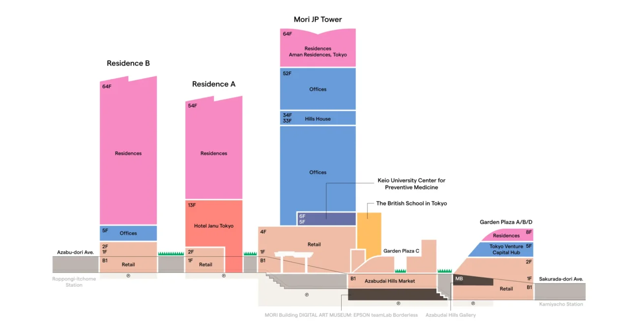 Девелопер Mori Building Co. десятилетиями продвигает идею «Вертикального города-сада». На гигантской диораме Токио (масштаб 1:1000) в их штаб-квартире видно, что город — это «море» тесной малоэтажной застройки. Azabudai Hills предлагает альтернативу: собрать людей в высокие башни, чтобы освободить землю для природы. В результате 24 000 кв. м (треть участка) превращены в парк, создавая оазис в центре бетонных джунглей.