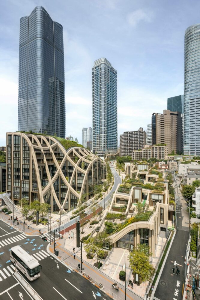Томас Хезервик разработал концепцию гигантской «перголы» — волнообразной сетчатой структуры, которая то поднимается, то опускается, повторяя холмистый ландшафт долины. Крыши малоэтажных зданий (ритейл, музеи, галереи) полностью озеленены. Газоны плавно перетекают в стены, создавая эффект, будто здания вырастают из земли. Работая со сложным участком неправильной формы площадью более восьми гектаров, Heatherwick Studio стремилось к гармонии и созданию уникального облика, характерного именно для Токио.