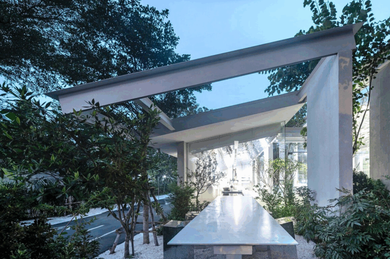 архитектура из бетона и стекла отражает тени окружающей растительности, создавая диалог с природой. Белые внешние стены служат полотном для игры света и тени, а зеркальные потолки наполняют интерьер отражениями растений.
