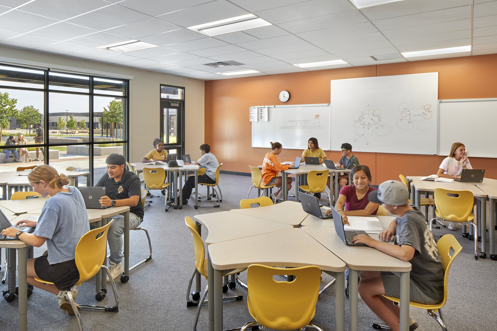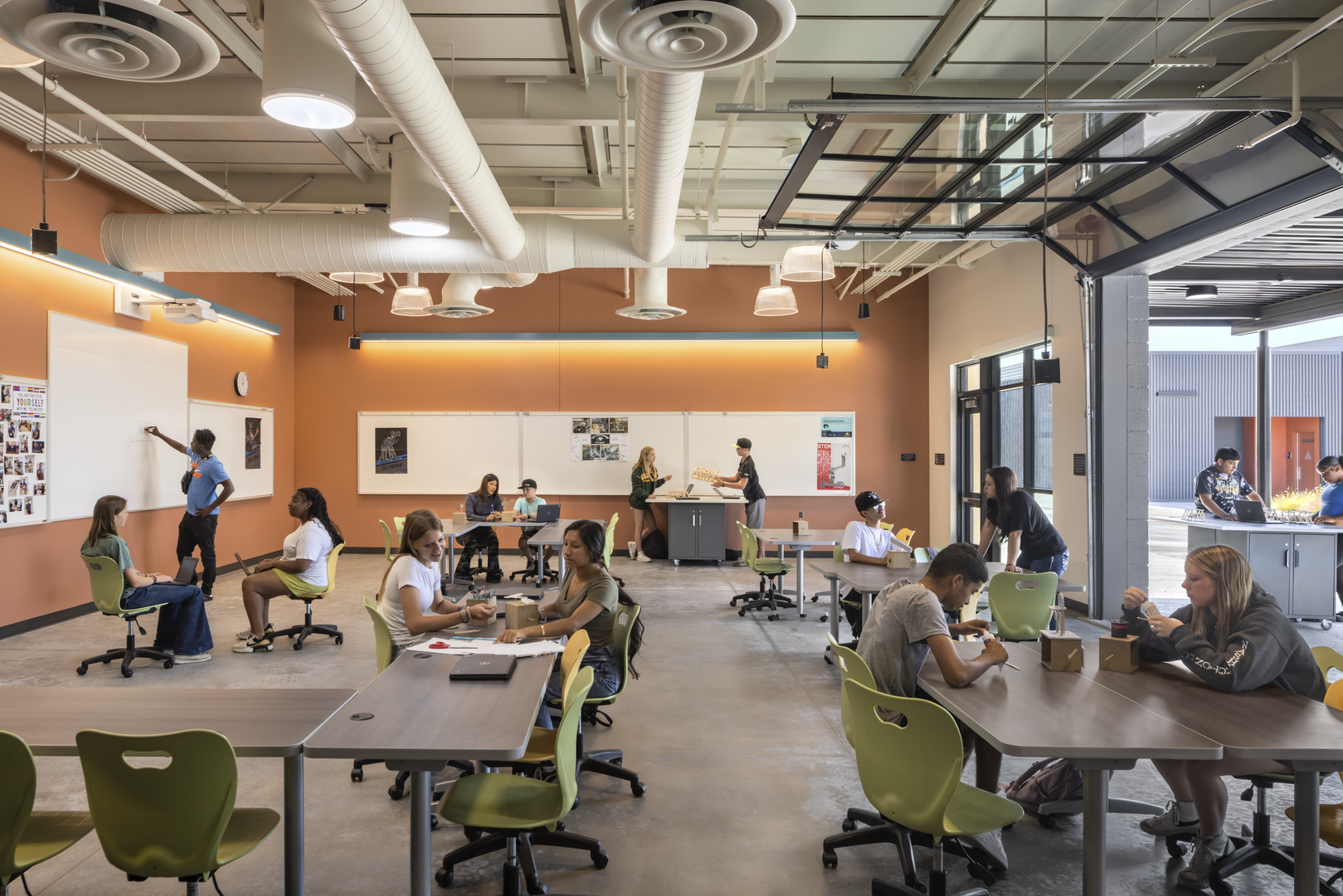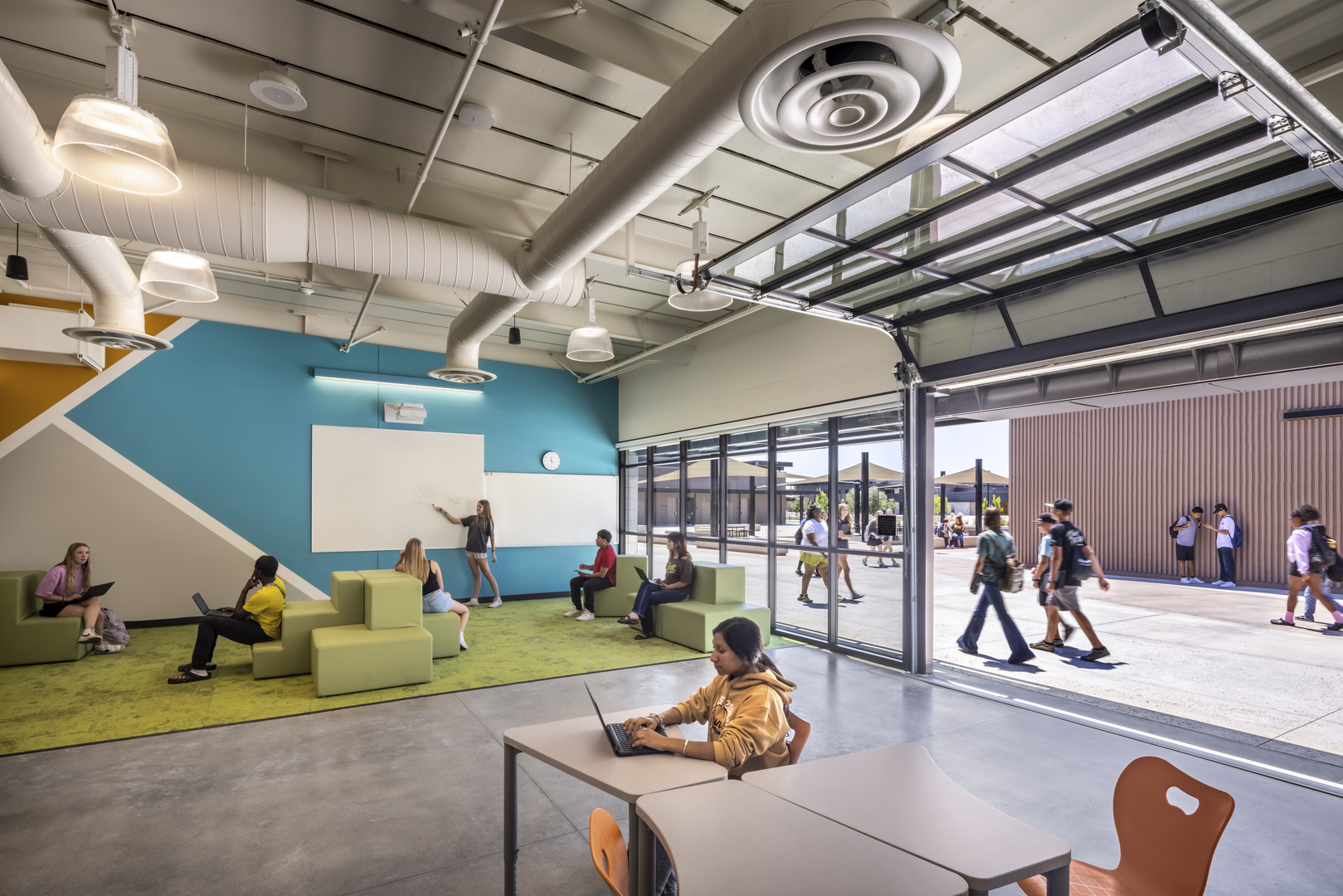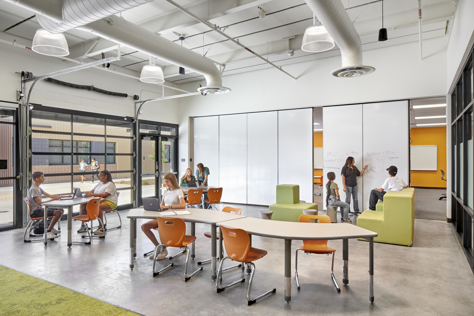 В основе дизайна Del Oro лежит философия эмпатии и поддержки, направленная на предоставление уязвимым учащимся возможностей для достижения полного потенциала. Архитекторы HMC Architects отошли от традиционных решений, чтобы преодолеть монофункциональность и негибкость пространства. Классы здесь спроектированы как текучие (fluid) пространства, которые легко адаптируются к различным методам обучения, размерам групп и интеграции технологий. Это достигается за счет использования гибких рассадок, мобильных и записываемых поверхностей, а также прозрачных стен (стекла), что способствует открытости, коллаборации и взаимодействию. Помимо обычных классов, были созданы Maker Spaces (мастерские) и Innovation Hubs — инкубаторы для креативности и инноваций, которые поддерживают критическое мышление и командное решение проблем.