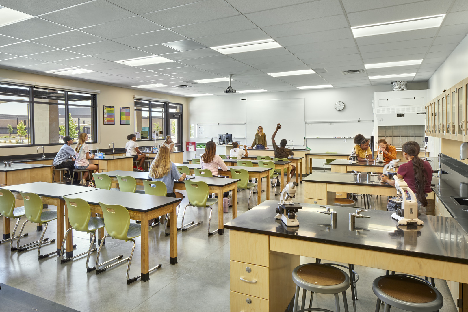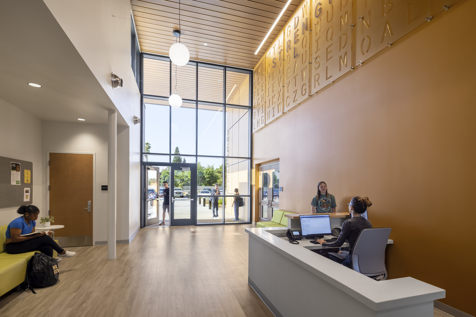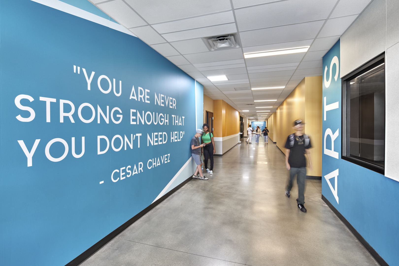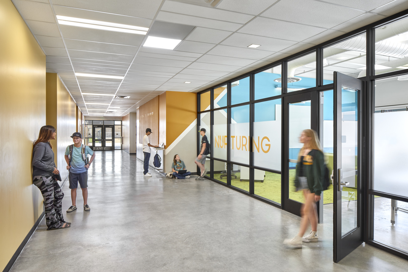 В основе дизайна Del Oro лежит философия эмпатии и поддержки, направленная на предоставление уязвимым учащимся возможностей для достижения полного потенциала. Архитекторы HMC Architects отошли от традиционных решений, чтобы преодолеть монофункциональность и негибкость пространства. Классы здесь спроектированы как текучие (fluid) пространства, которые легко адаптируются к различным методам обучения, размерам групп и интеграции технологий. Это достигается за счет использования гибких рассадок, мобильных и записываемых поверхностей, а также прозрачных стен (стекла), что способствует открытости, коллаборации и взаимодействию. Помимо обычных классов, были созданы Maker Spaces (мастерские) и Innovation Hubs — инкубаторы для креативности и инноваций, которые поддерживают критическое мышление и командное решение проблем.