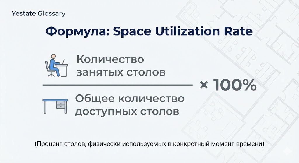 Утилизация — это метрика, отражающая реальную интенсивность использования офисного пространства в течение определенного времени. Она показывает, какой процент рабочих мест или площадей физически занят людьми в конкретный момент, в отличие от того, сколько мест закреплено за сотрудниками или арендовано по договору.