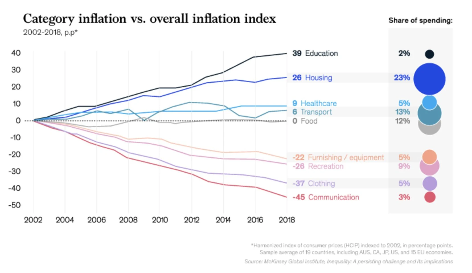 Технологии и глобализация сделали многие дискреционные товары дешевле. Однако основные расходы, такие как образование, жилье и здравоохранение, выросли по сравнению с уровнем инфляции за последнее десятилетие.