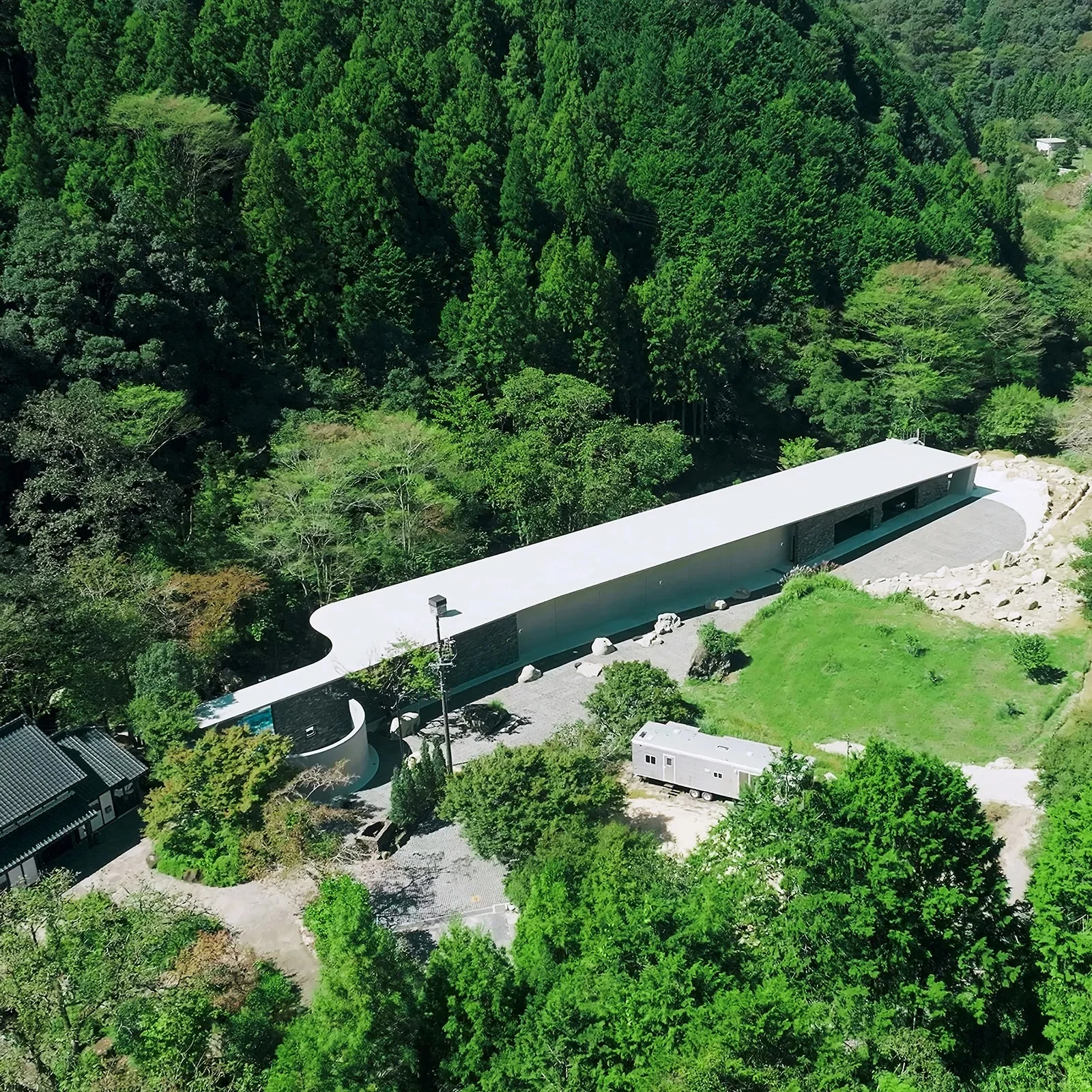 - Вдохновение:«Эта архитектура расположена в месте, где природа леса и реки. Она была построена рядом с существующим зданием, которое является старым японским традиционным деревянным архитектурным стилем. Клиент использовал существующий традиционный японский дом как виллу и построил новое здание рядом с ним как место для своей собственной творческой деятельности. Мы спроектировали архитектуру так, чтобы она гармонировала с этой традиционной архитектурой и природой. Контраст между традиционными старыми деревянными конструкциями и современными мощными конструкциями из бетона. Она была спроектирована с учетом ландшафта, сохраняя низкую высоту и вдоль наклонной поверхности».