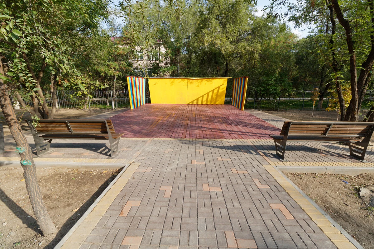 На этом участке, в 2017 году, параллельно с нашим исследованием Тастака, была построена сцена театра “Соседи”. Они помогали нам продвигать исследование тоже. В течение двух лет, в теплое время они проводили мероприятия, перфомансы и кинопросмотры. В этом году акимат решил улучшить доступность сцены. Я подсказал как это сделать.