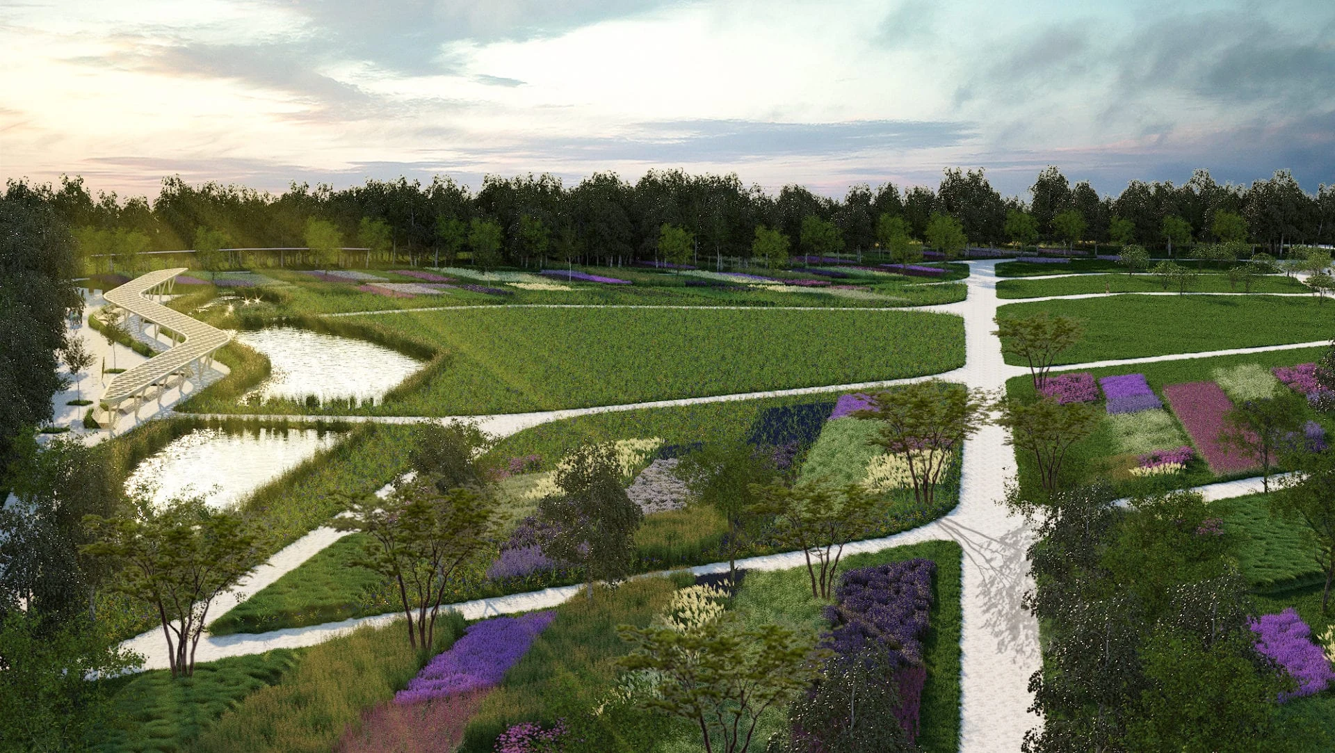 Длинная пергола вдоль озер позволит посетителям, сидя в тени, наслаждаться живописным пейзажем. В южном партере предусмотрен общественный огород, где будут проходить обучающие мастер-классы, школьные уроки по ботанике и посадки с участием посетителей сада.