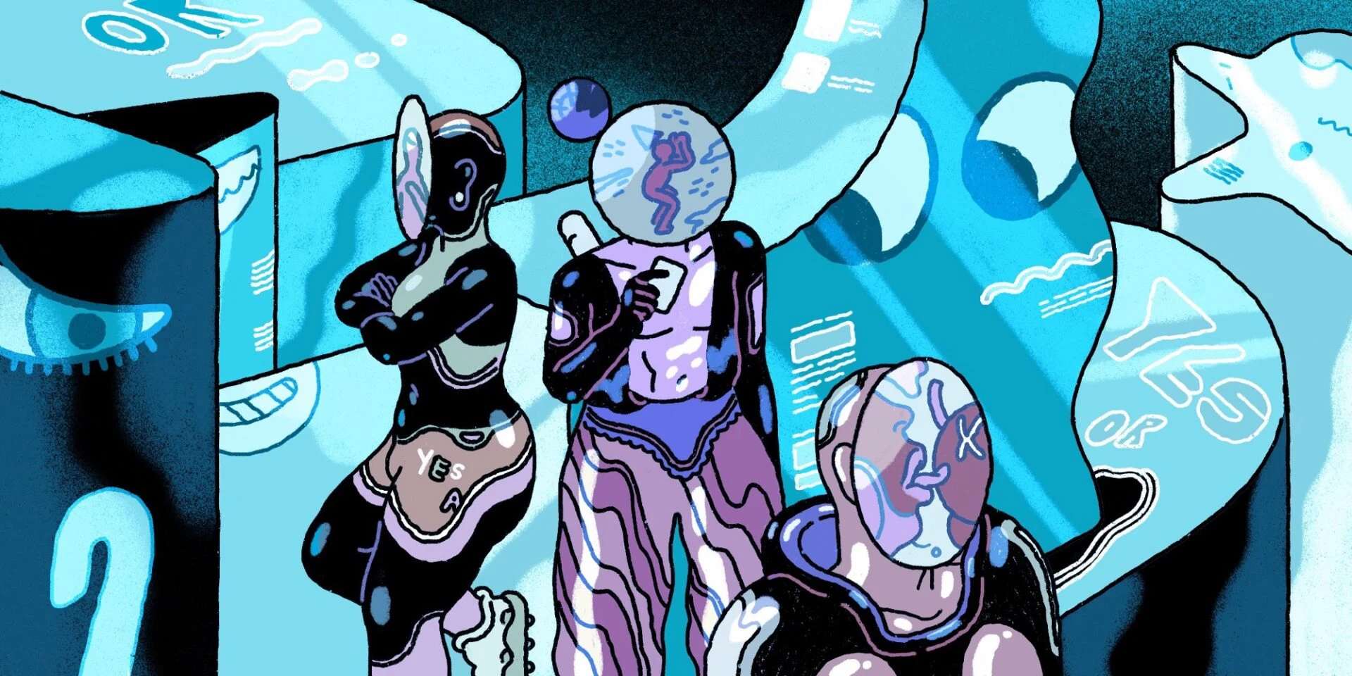 Вместе со своими иллюстрациями каждый художник написал о своем воображаемом будущем. Их идеи дикие, смелые и радикально отличаются друг от друга: смешивать и сочетать части тела, маски аватаров и тела дронов.