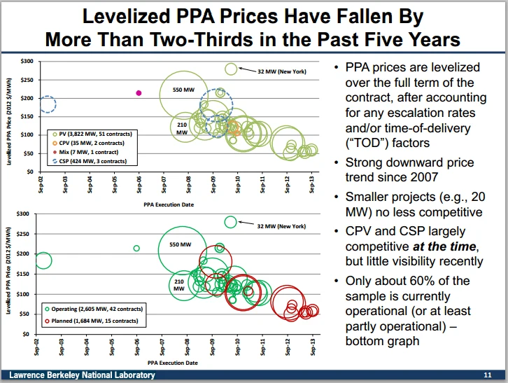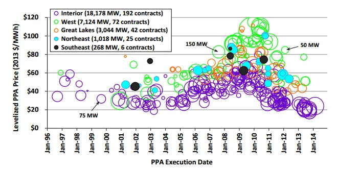 Еще один способ изучения цен заключается в рассмотрении цен, согласованных в соглашениях о покупке электроэнергии (PPA).