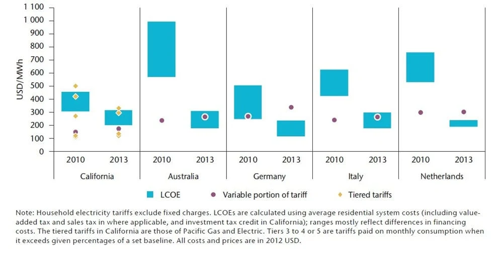 Вышеприведенное обсуждение полностью касается только оптовой электроэнергии. Солнечные электростанции общего назначения вырабатывают электроэнергию по более низкой цене, чем частные солнечные энергосистемы на крыше (благодаря экономии на масштабе), но разница, как правило, не так велика, как разница между общими розничными и оптовыми ценами на рынке. Это означает, что солнечная энергия на крыше дешевле, чем розничная электроэнергия от Вашей «дружественной коммунальной службы» (сарказм) даже в большем количестве мест, чем солнечная энергия коммунального масштаба, которая превосходит другие варианты на оптовом рынке электроэнергии. В среднем, солнечная энергия на крыше достигла «паритета розеток» или «перитета сетей» в Германии, Нидерландах, Италии, Австралии, Гавайях, Калифорнии, Аризоне и некоторых других странах и штатах США.