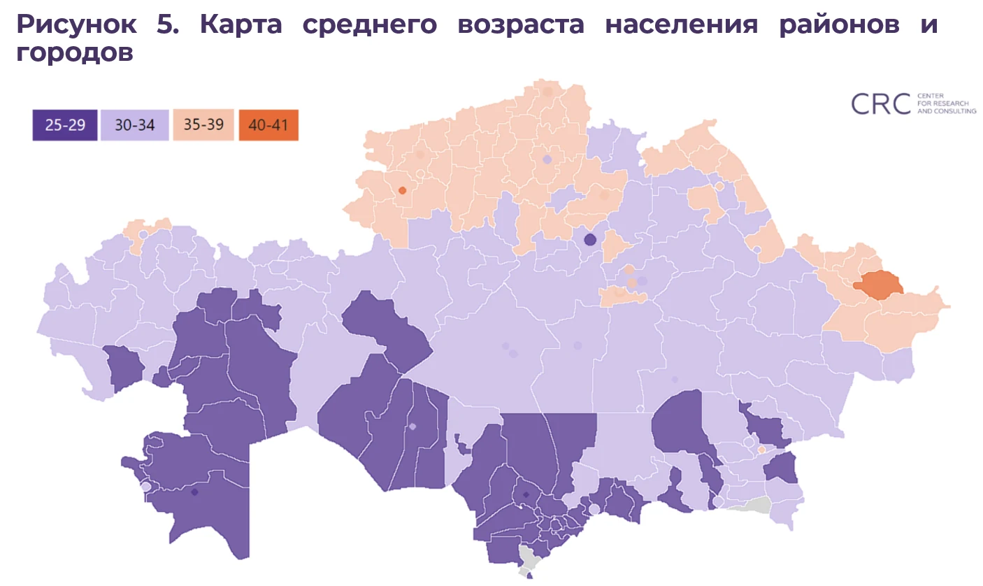 На севере и востоке страны проживает в среднем более взрослое население. К этим районам и городам относятся территории ВКО, Павлодарской, Акмолинской, СКО, Костанайской областей и один район в ЗКО.