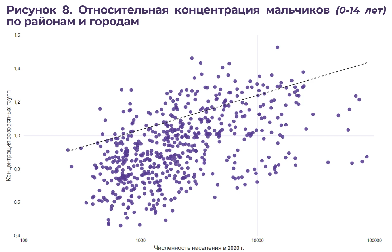 Детальный анализ (Рисунок 8) демонстрирует тренд, что доля мальчиков в возрасте 0-14 лет растет по мере увеличения их численности (аналогично для девочек).