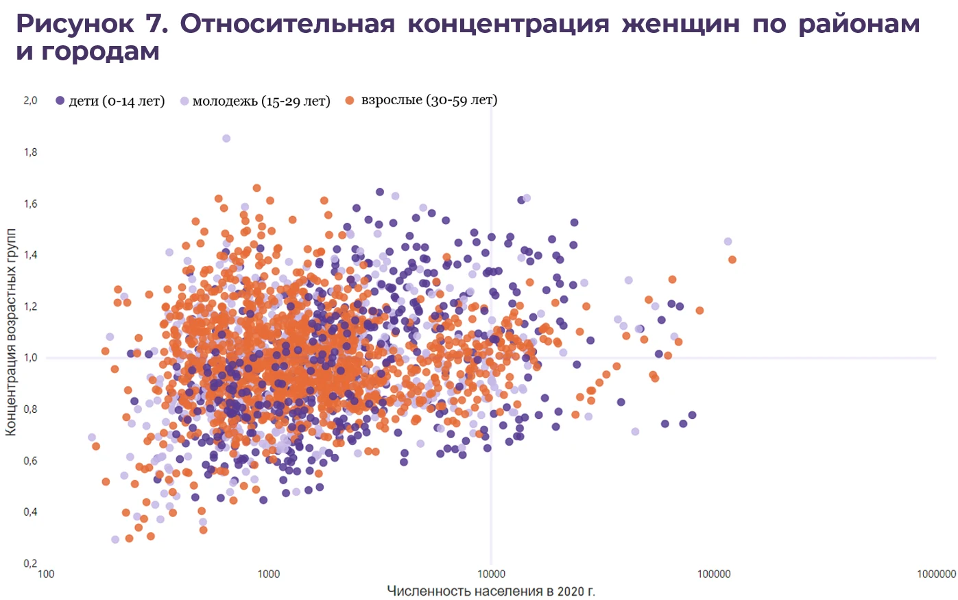 Относительная концентрация районов – это соотношение доли одной половозрастной группы в районе к доле этой половозрастной группы в стране. К примеру, если доля девочек в возрасте 5-9 лет равна 5% в одном районе, а по стране – 3%, то относительная концентрация будет 1,7 (5%/3%).