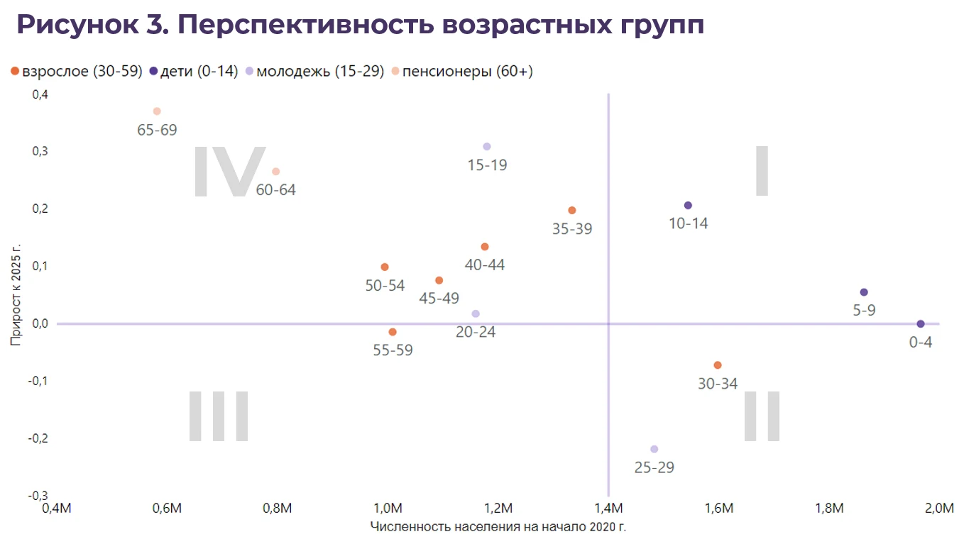 Практически все взрослое население занимает третий квадрант, что говорит об их положительном росте к 2025 году.