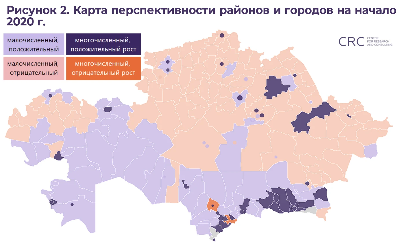 Наименее перспективные районы и города находятся в четвертом квадранте (Рисунок 1). Это небольшие по численности населения территории с отрицательными темпами роста. Насчитывается 99 таких районов и городов. Многие находятся в приграничных с Россией регионах, а также Акмолинской и Карагандинской областях.