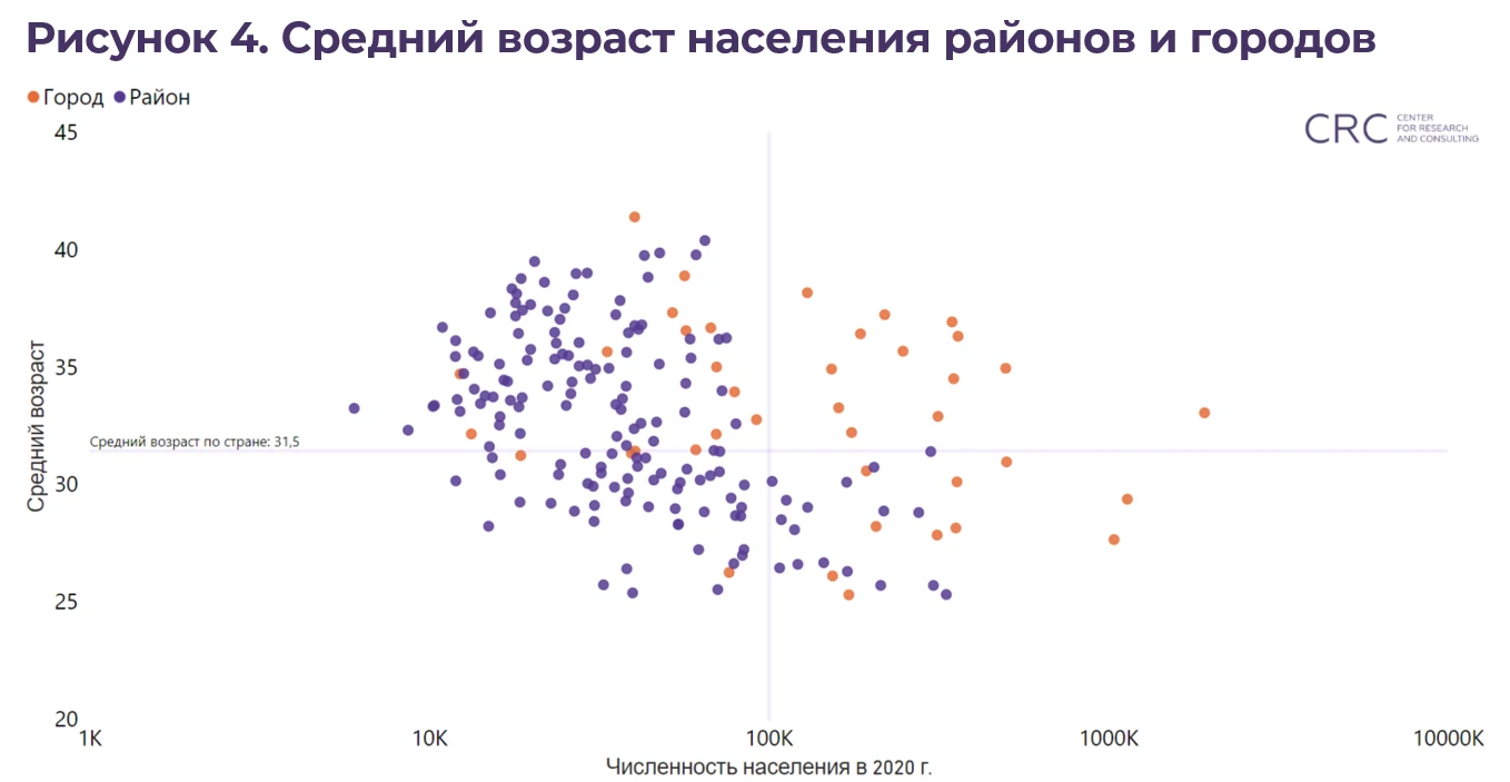 Наиболее «взрослыми» районами являются г. Лисаковск Костанайской области и район Алтай ВКО, средний возраст которых превышает 40 лет.
