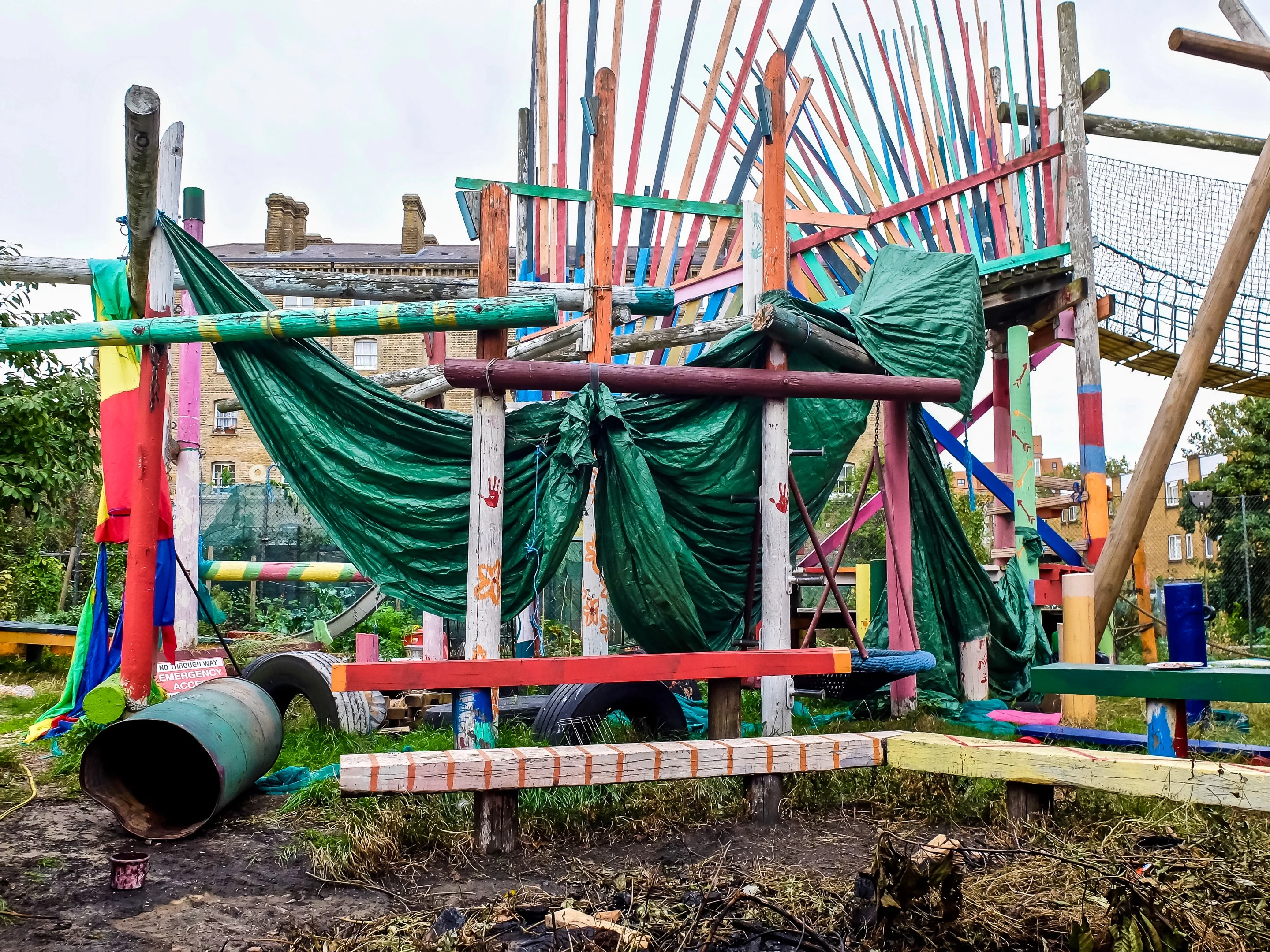 The Land — это игровая площадка для детей, которая совершенно не похожа на привычные нам, ухоженные, предельно безопасные игровые территории. На первый взгляд она напоминает обычную свалку. Да-да, именно так: куча старых покрышек, помятые мусорные баки, бессистемно валяющийся строительный материал (доски-палки-листы пластика и фанеры), веревки, висящие там и тут, месиво земли под ногами вместо прорезиненной мягкой поверхности или пушистой зеленой травки.