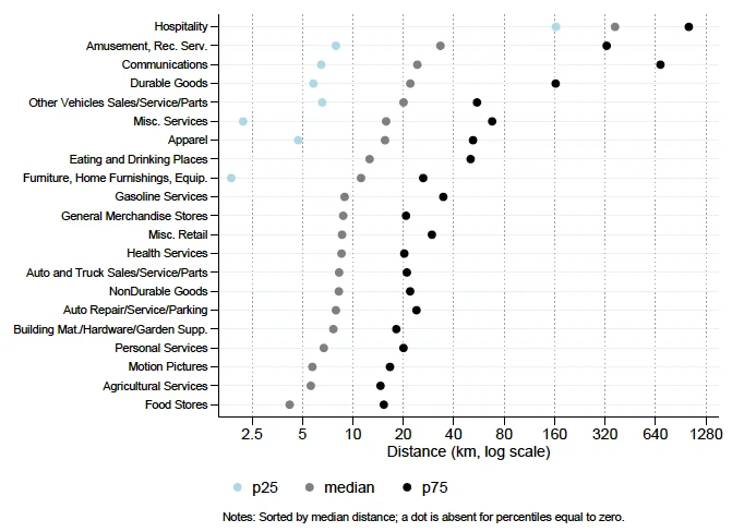Ограниченная готовность потребителей путешествовать видна на рисунке 1, который показывает распределение расстояний, пройденных потребителями по различным секторам. Медиана транзакций в данных происходит примерно в 9 км от дома, и наблюдается большая неоднородность в наблюдаемых поездках как внутри, так и между секторами. В целом средняя транзакция происходит в 4 км для основных продуктов, таких как продовольственные магазины, и около 12 км для мест, где можно поесть и выпить; однако он превышает 20 км для товаров длительного пользования и 33 км для развлечений и развлекательных услуг, которые, вероятно, приобретаются реже.
