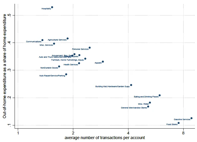 В таком случае более глубокое понимание мобильности потребителей потенциально может иметь большое значение для широкого круга вопросов, имеющих отношение к политике, включая развитие городской и инфраструктуры. (Kline и Moretti 2014) в целом. В недавнем документе мы используем данные о 1,7 миллионах транзакций по кредитным картам, чтобы предоставить первое межотраслевое описание местных рынков потребления, и утверждаем, что мобильность потребителей, по-видимому, по-разному влияет на местную занятость, плотность заведений и их размер (Agarwal). и др. 2018).