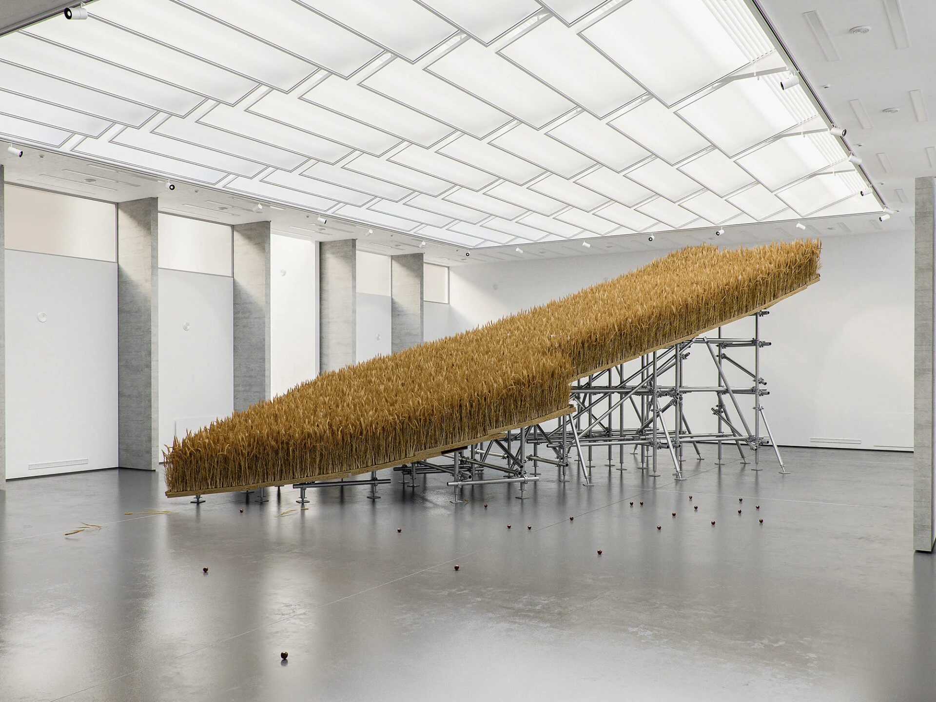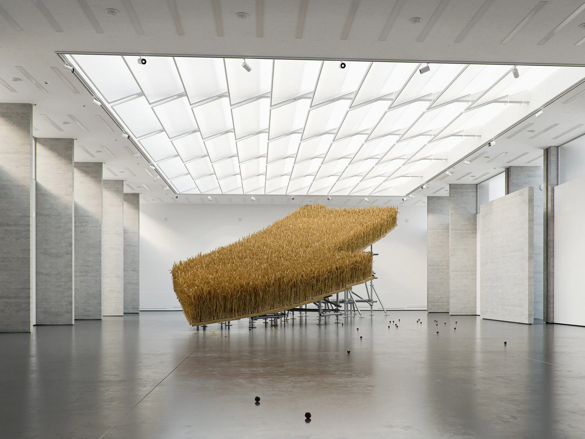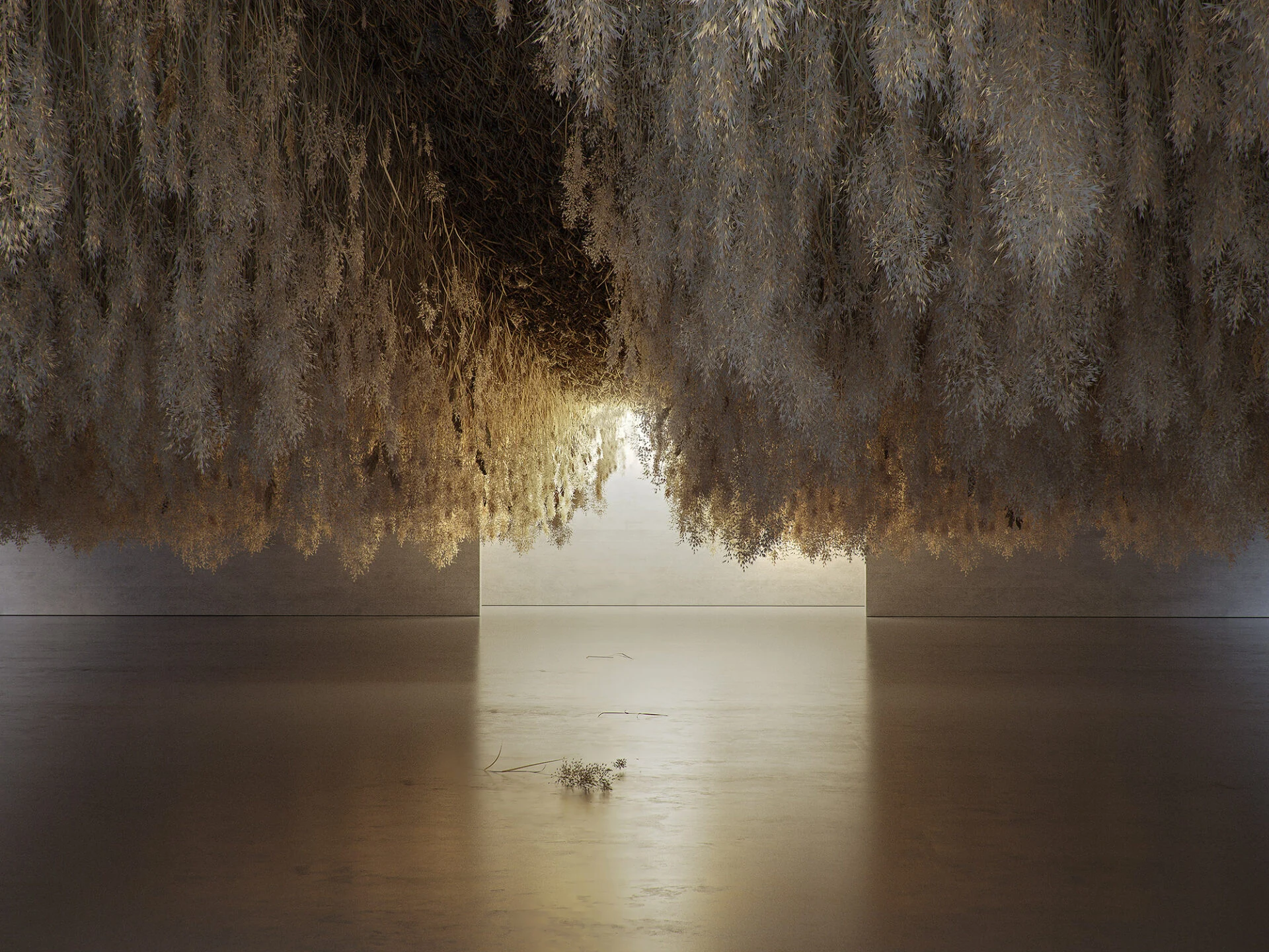 В масштабной инсталляции Тадао Серна «Французский выход» облако перистой травы нависает над комнатой