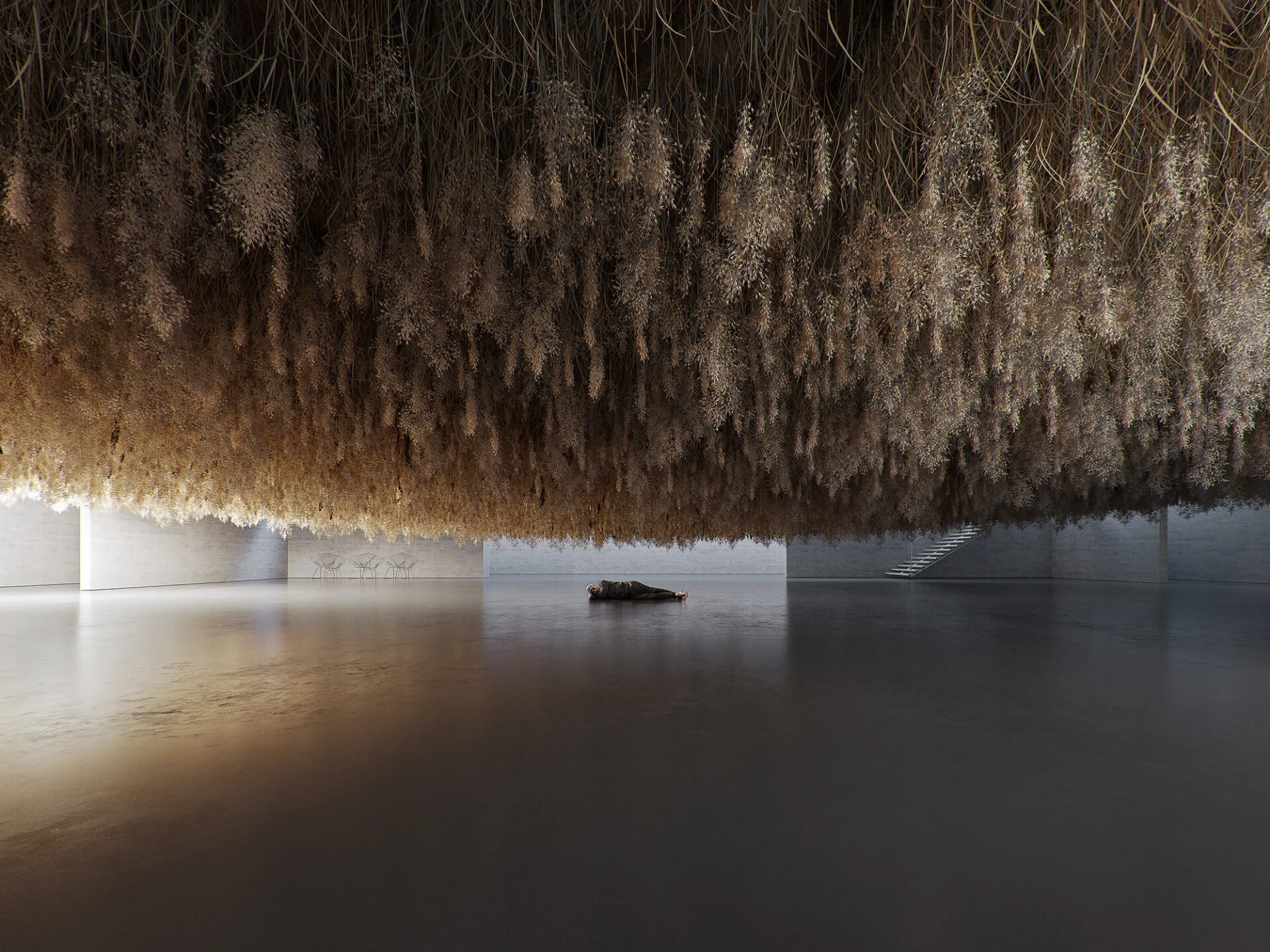 Иммерсивное произведение искусства сопоставляет эфемерный, высушенный материал со зрителями, стоящими под ним, поскольку оно создает успокаивающее и интроспективное пространство для…