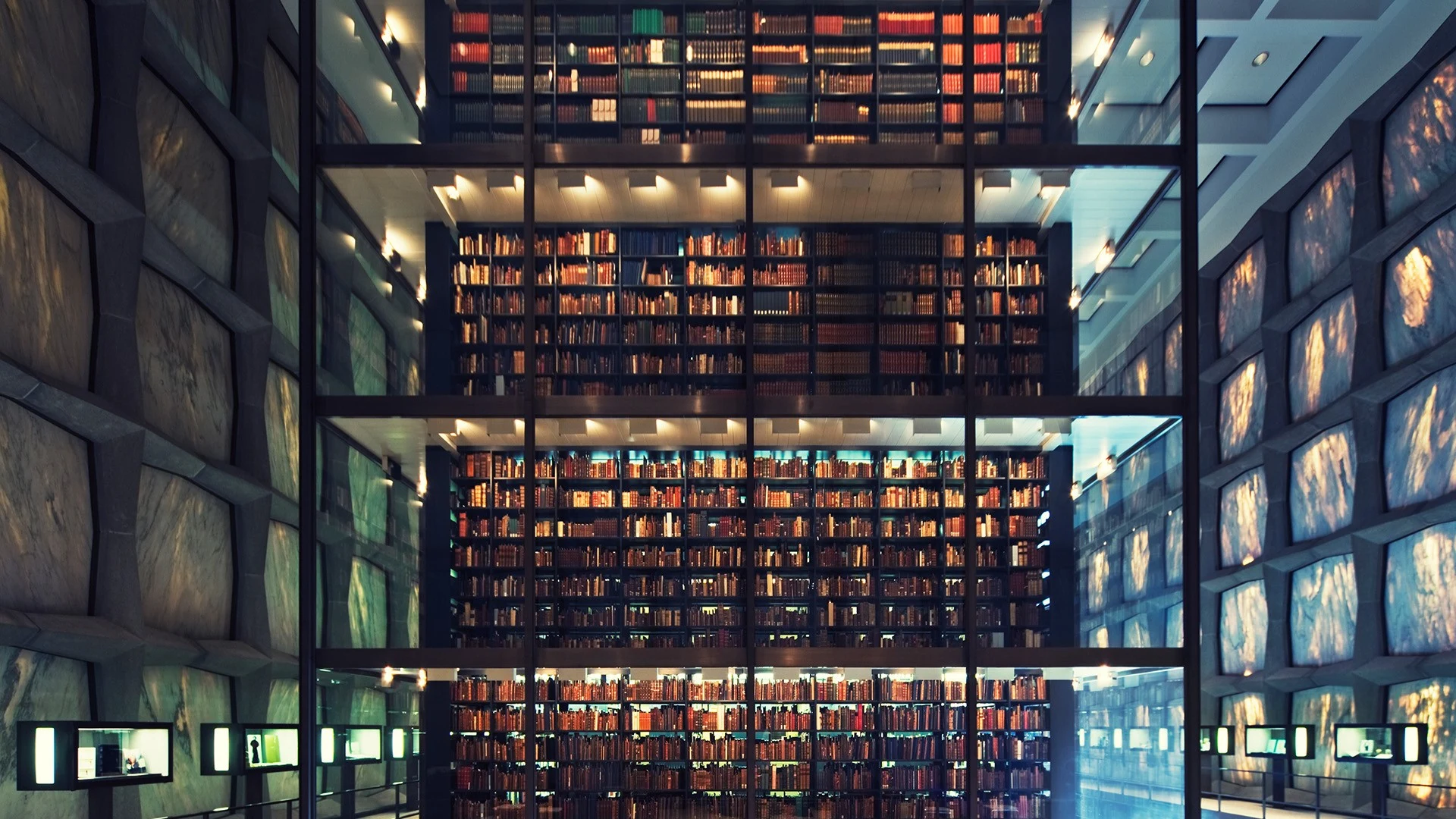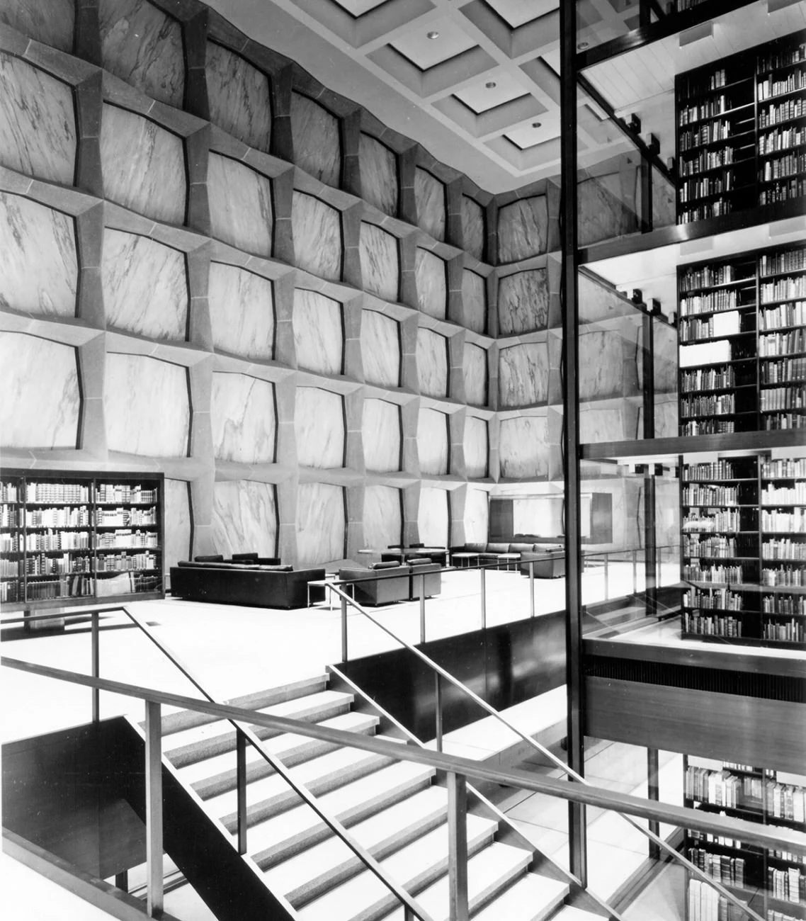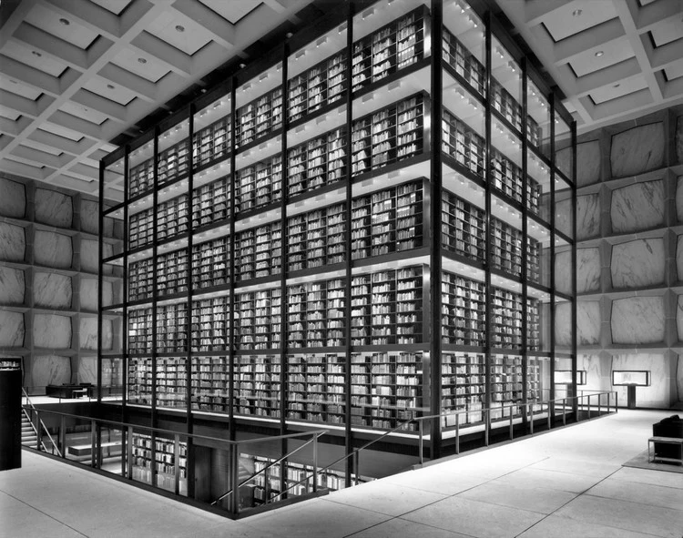 Библиотека Бейнеке окружена защитной каменной оболочкой, известна своим прозрачным мраморным фасадом и всемирно известной стеклянной книжной башней, с впечатляющим внутренним оформлением, обусловленным особыми требованиями хранения литературных артефактов