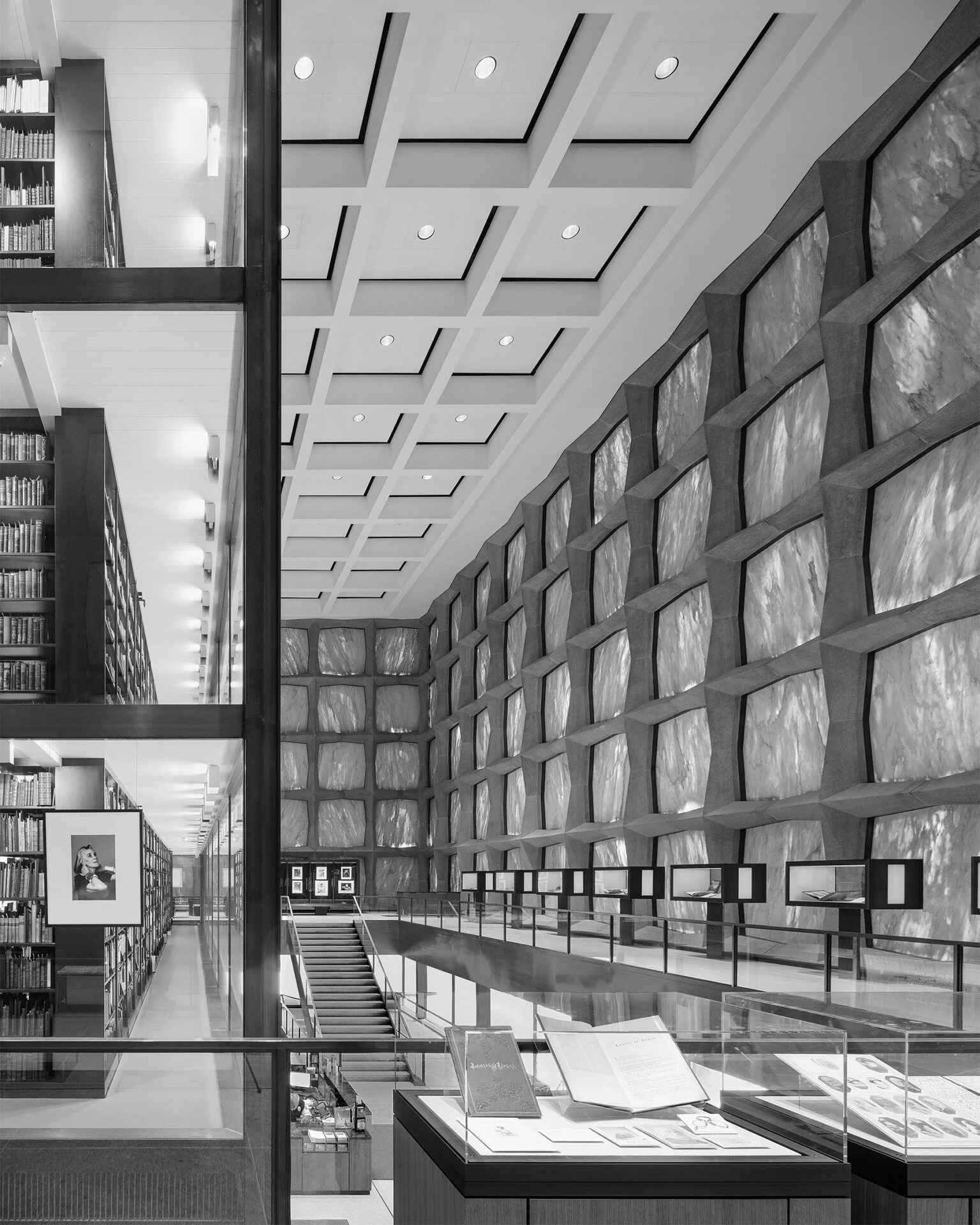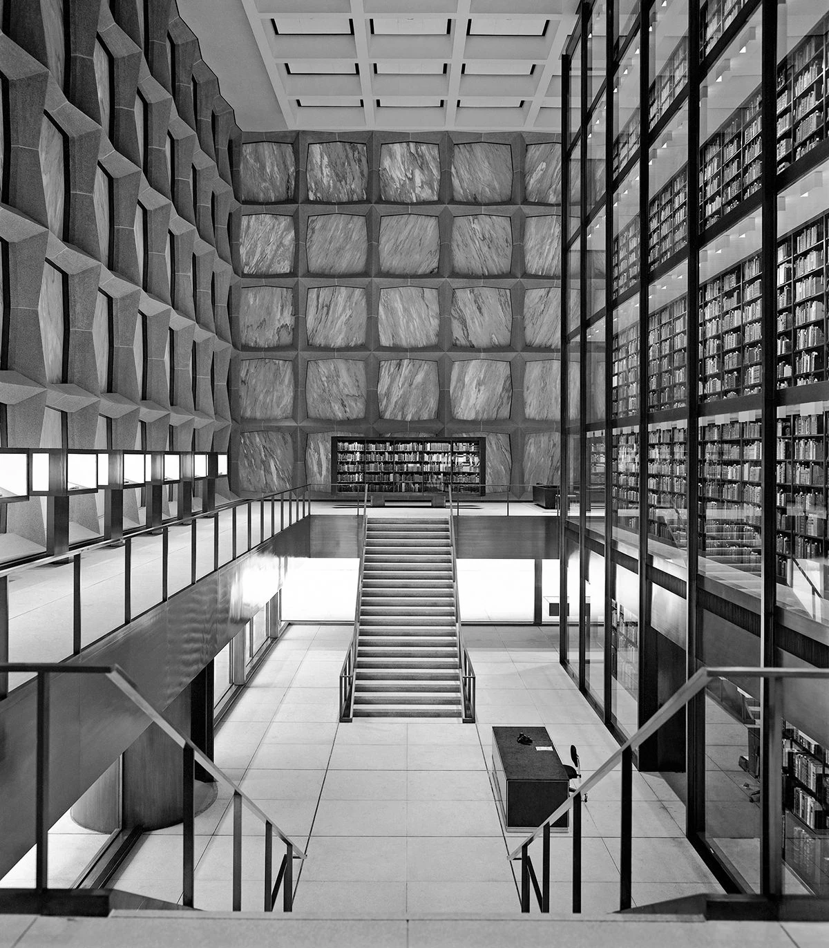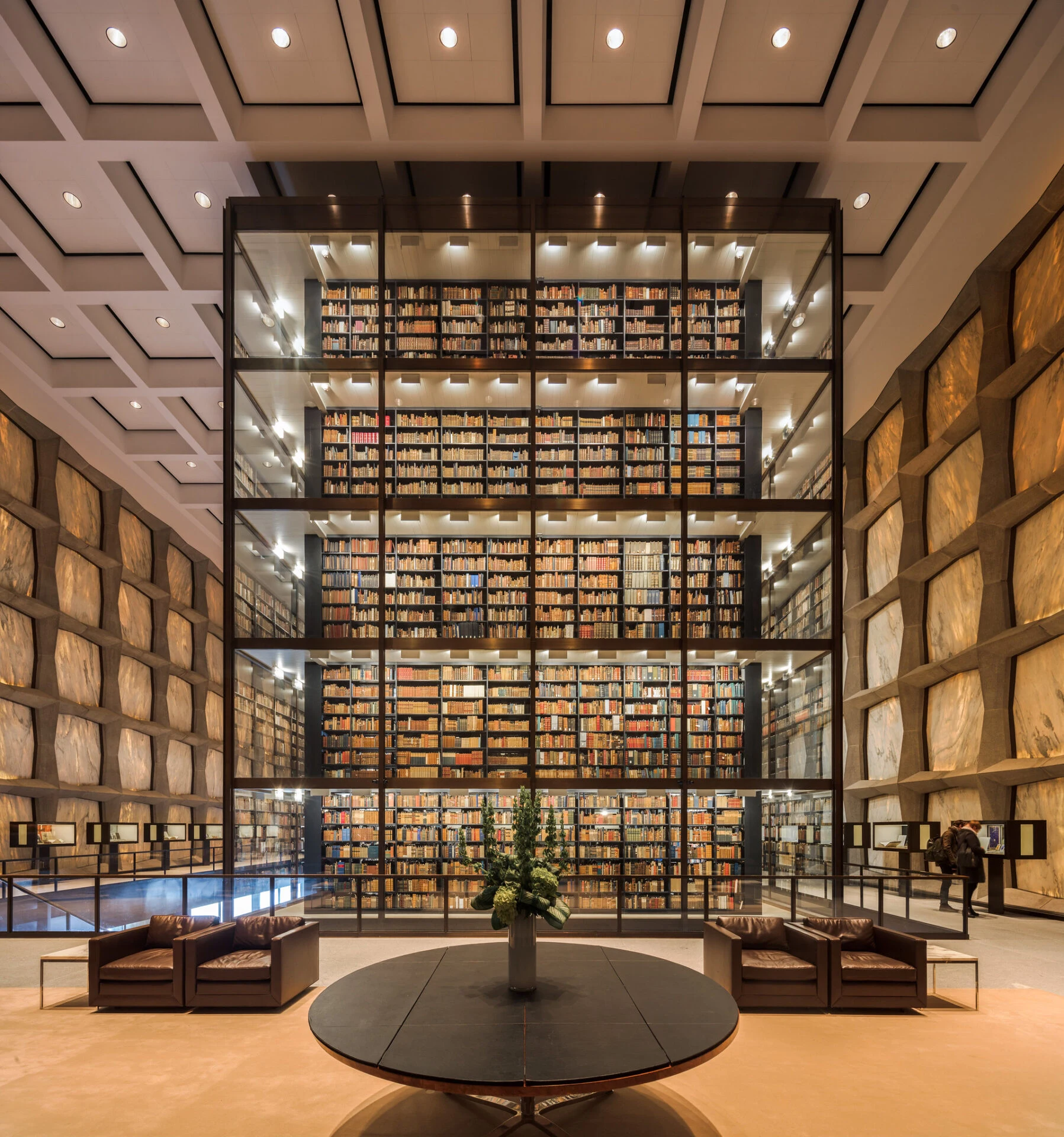 Библиотека Бейнеке окружена защитной каменной оболочкой, известна своим прозрачным мраморным фасадом и всемирно известной стеклянной книжной башней, с впечатляющим внутренним оформлением, обусловленным особыми требованиями хранения литературных артефактов