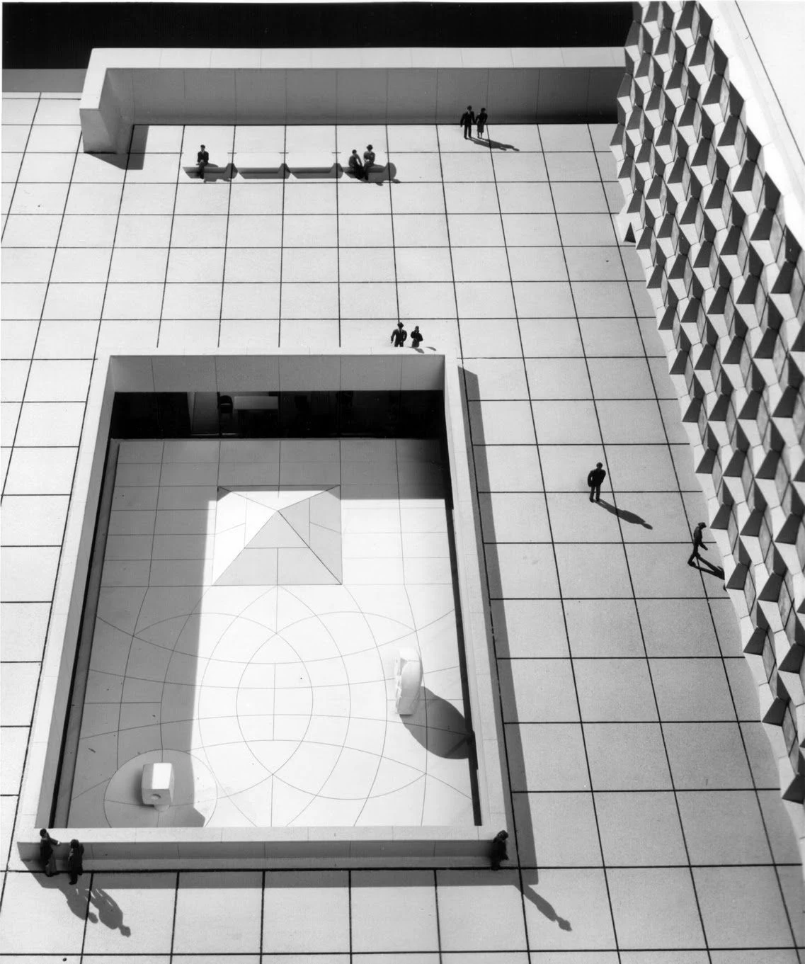 Естественный свет проникает в подвальные этажи через утопленный двор, напоминающий монастырский скрипторий.