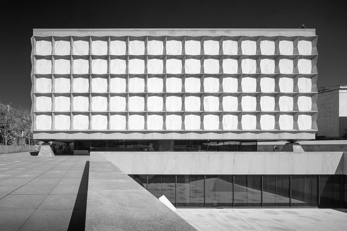 Внешний каркас соответствует золотому сечению: пятнадцать мраморных блоков проходят по фасаду здания, пять — вертикально, а десять — по глубине, что соответствует соотношению 3: 1: 2. Это также дань коллекциям, поскольку страницы многих ранних книг и рукописей выложены в этой пропорции, что считается приятным для глаз и благоговейным по отношению к тексту.