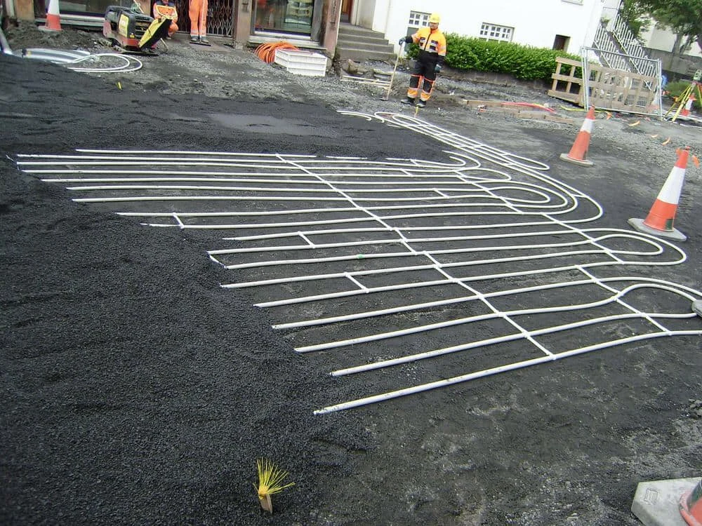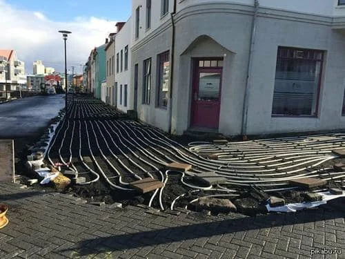 Выше под брусчаткой или асфальтом мы кладём нагревающий провод. Поверхности делаем с уклоном к месту вертикально слива талых вод в магистральный дренаж.