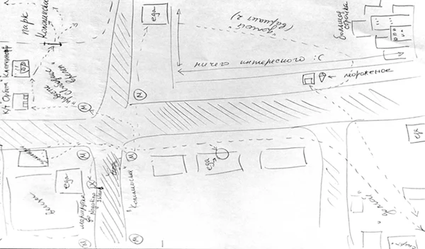 Чтобы метод сработал, одного жителя и одной ментальной карты, конечно, мало. Нужно провести несколько интервью, чтобы нарисовать подробную картину видения местности ее жителями: что в ней есть, чего не хватает, что надо исправить. Нужен анализ ментальных карт людей разных возрастов, сфер деятельности и жителей разных домов.