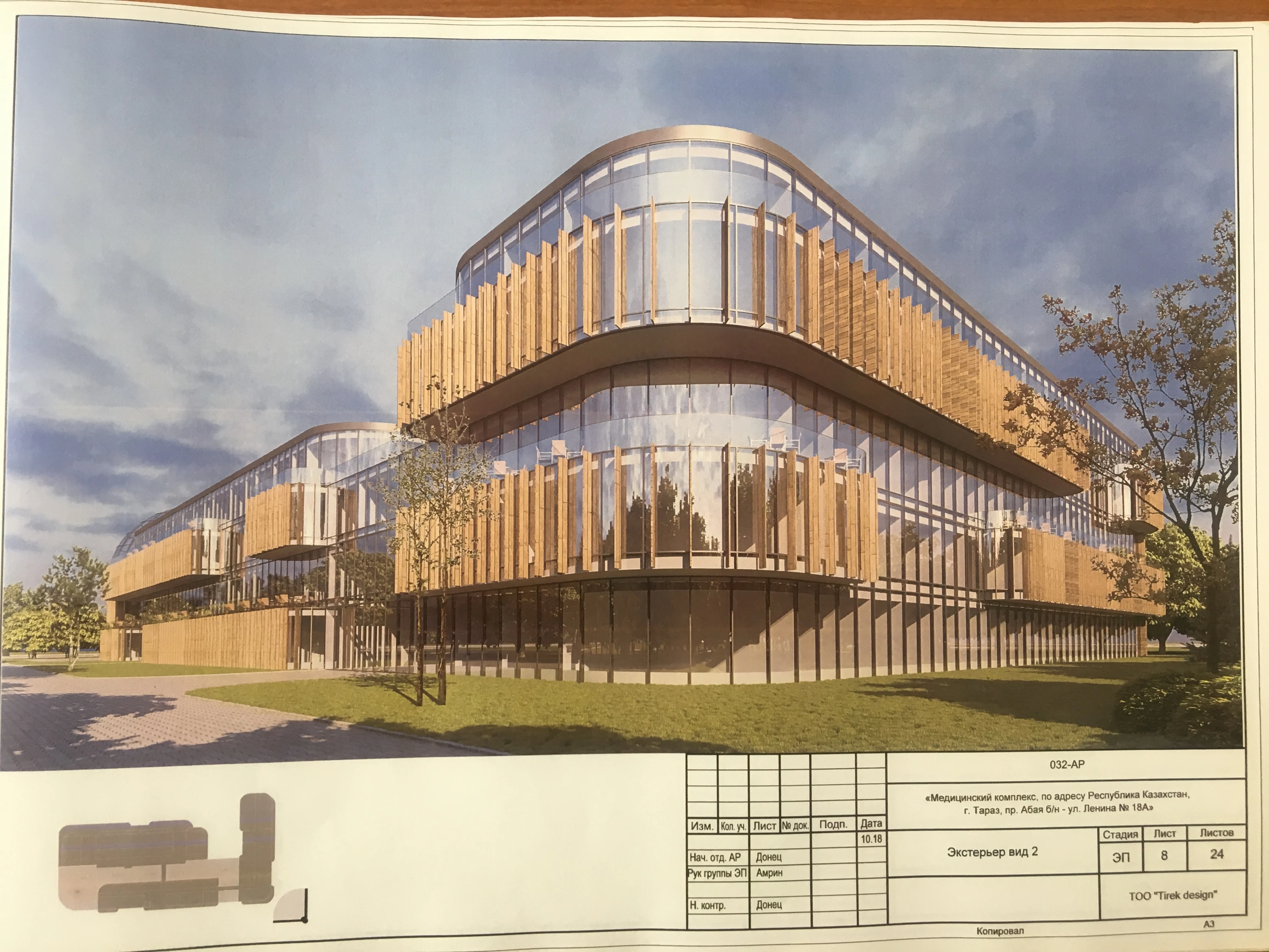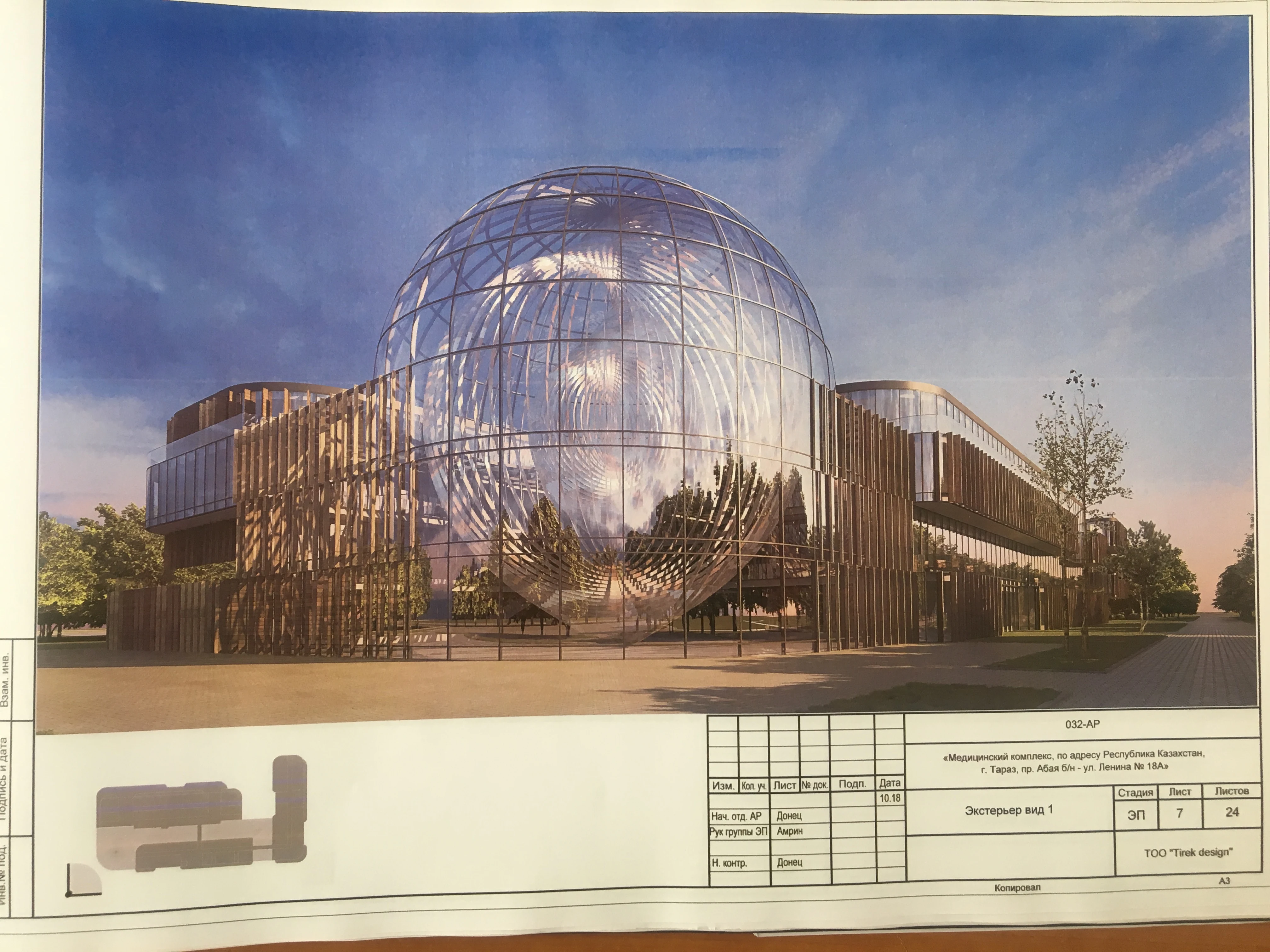 В результате кропотливой работы мы создали эскизный проект многофункционального центра (медицинский комплекс, кафе, СПА) площадью более 30 000 м2, которым по праву можем гордиться. Этот объект мог бы стать украшением г.Тараз, знаковым местом в городе, где люди с удовольствием бы проводили время. Эскизный проект прошел согласование в Управлении архитектуры, что подтверждает качество выполненных работ.