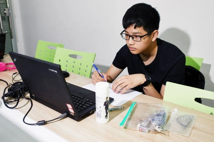 Средством обучения является ноутбук. И ученики, и учителя пристально смотрят на экраны. В одной комнате двое учеников в наушниках заняты уроком английского языка. В другом случае трое учеников, включая Чжоу, посещают три отдельных класса по математике. Они решают практические задачи на листках бумаги, прежде чем отправлять свои ответы в Интернете. В каждой комнате учитель наблюдает за учениками через приборную панель в реальном времени.