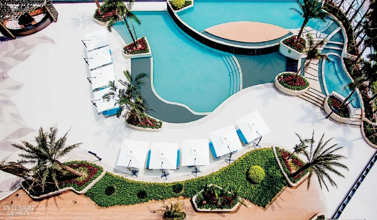 Своеобразную обстановку уединения представляют деревянные решетчатые стены, а вертикальный сад лишь подчеркивает стильный дизайн вестибюля. Высокие пальмы и висячий сад на плавучей палубе весьма романтично смотрятся на фоне частных кабинок и шезлонгов.