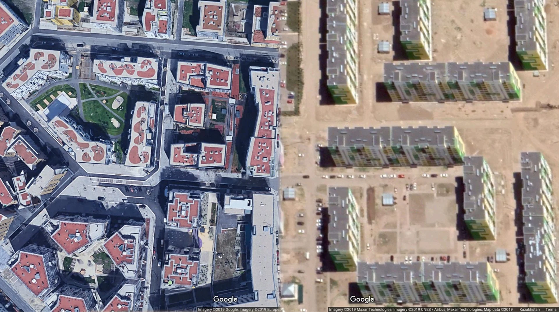 Вот новейшие строящиеся многоквартирные районы на отдаленных окраинах Вены и Алматы. Одинаковое расстояние от центра. И там и там идёт активная стройка. Только в одном случае мы получаем город, а в другом то, что свидетели высокой плотности называют “благо”.
