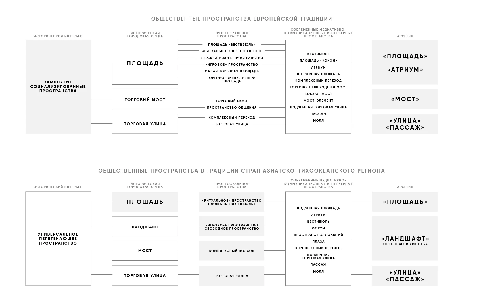 Данные характеристики общественных пространств выделяют два укрупнённых типа: особенности, связанные с архитектурно-пространственными характеристиками (строение, размерность, композиционная структура и геометрия) и внеархитектурные условия и параметры (технология, эксплуатация, природно-климатические и ландшафтные факторы, полифункциональность пространства, специфика предметного наполнения среды). Оба типа формируют свою систему видения и представления, а следовательно и требований, что в влечет несогласованность действий, малоэффективные проектные решения, и в последствии не комфортную среду.