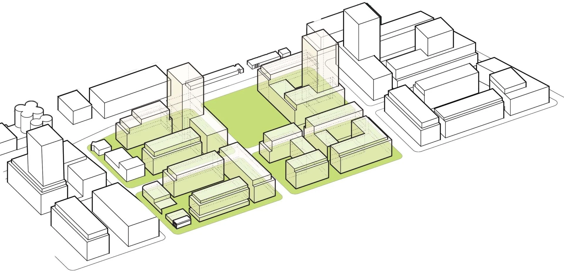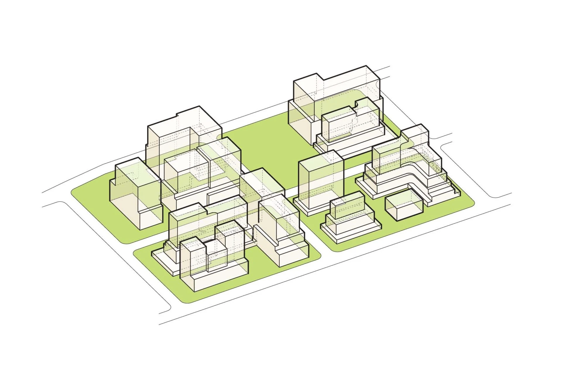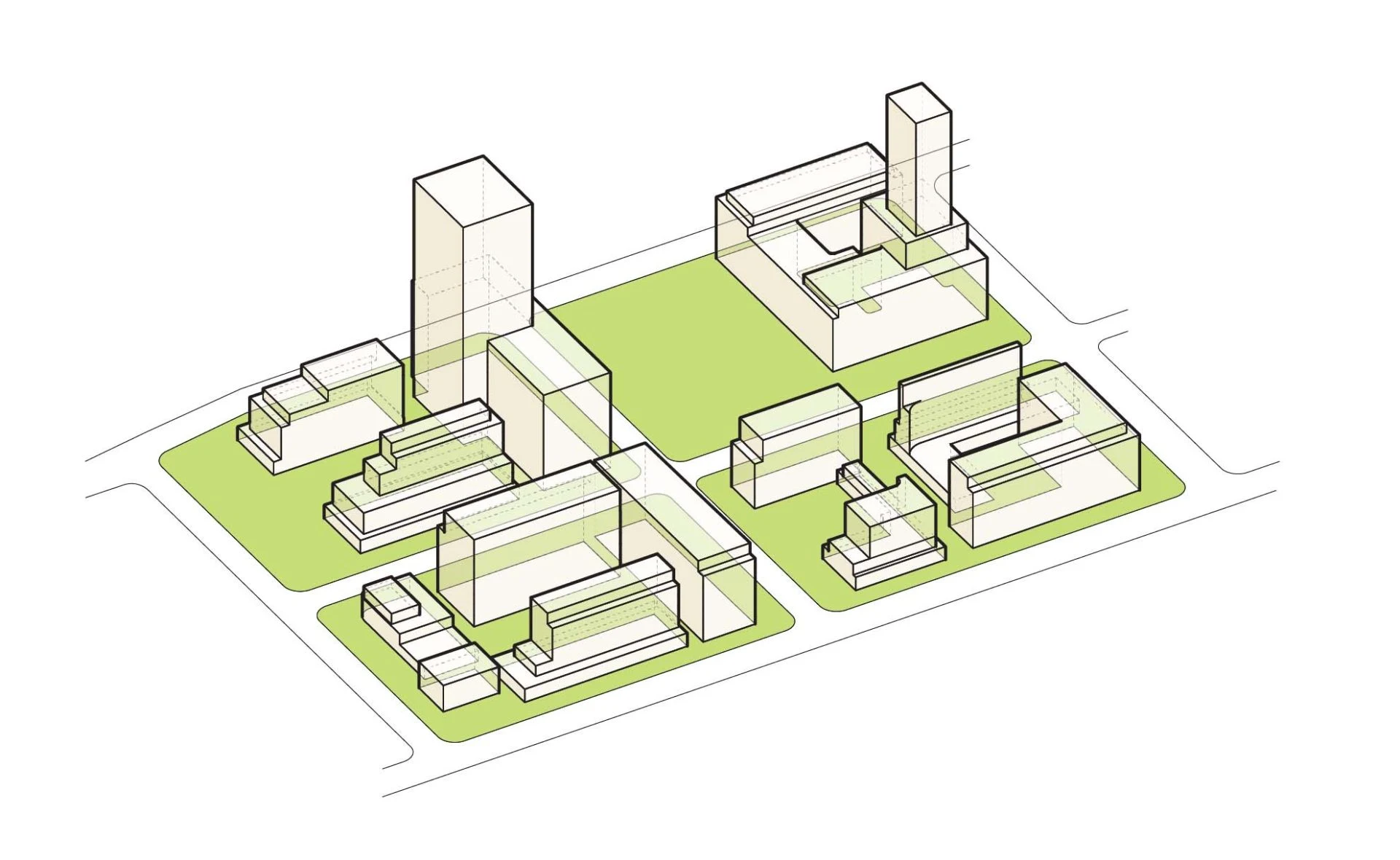 Это моделирование внесло более умеренные изменения в базовый план, изменив построенную форму в каждом блоке, сохранив большое открытое пространство в правом верхнем углу. В результате этот дизайн создает небольшое увеличение открытого пространства, но среднее увеличение плотности и большое увеличение доступа дневного света.