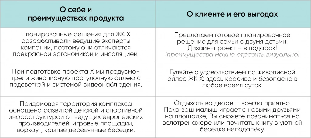 Информацию, которую девелопер рассказывает «о себе», клиент может принять к сведению, а может и не оценить вовсе: какая еще эргономика? Что мне от вашей инсоляции? Во втором случае покупатель «примерит» проект на себя, сможет ярче представить в нем себя и свою семью. Рассказывайте о клиенте, и положительная реакция не заставит себя ждать.