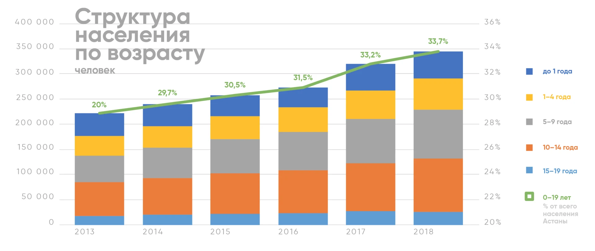 Сухая статистика говорит о том, что в Астане 34% всего населения младше 20 лет, причём за последние 5 лет число детей и подростков возросло с 225 тысяч человек до 347 тысяч, или аж на 54%. Для сравнения, весь город вырос только на 32%.