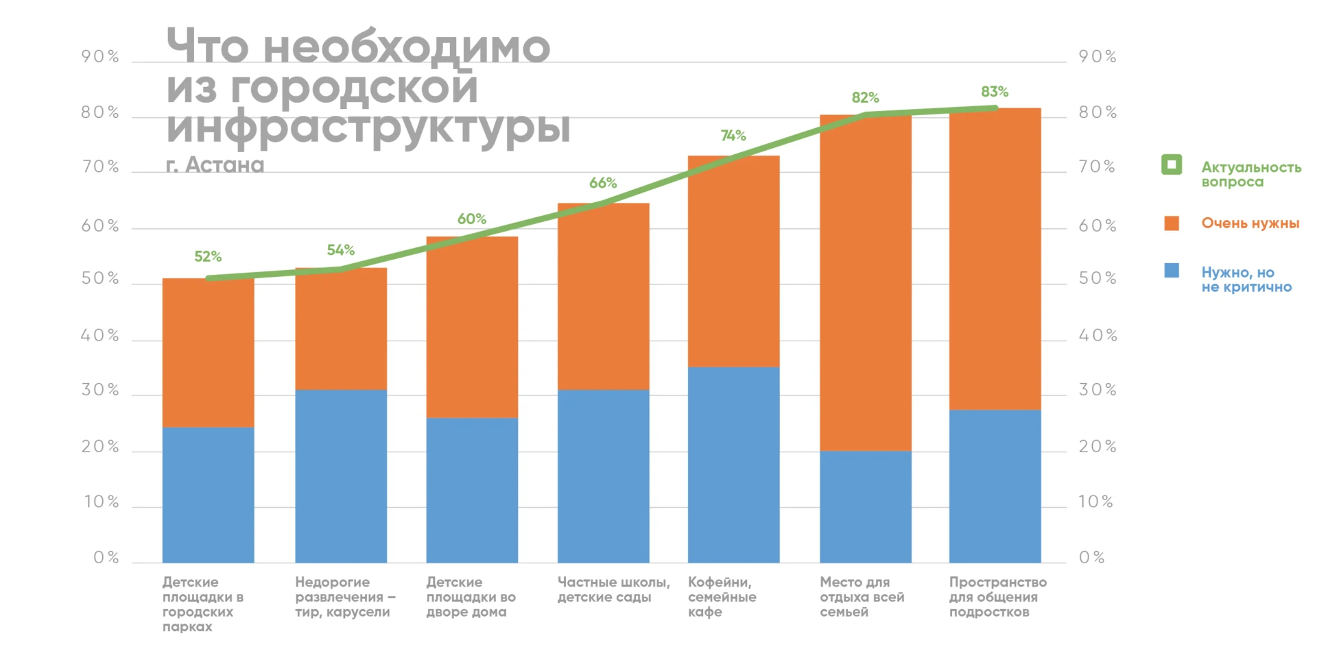 В одном из опросов, мы попросили горожан указать то, что лично им необходимо в городской инфраструктуре и были удивлены единством мнений. Наиболее критичными по потребности оказались места для семейного досуга (82%) и пространство для подростков (83%).