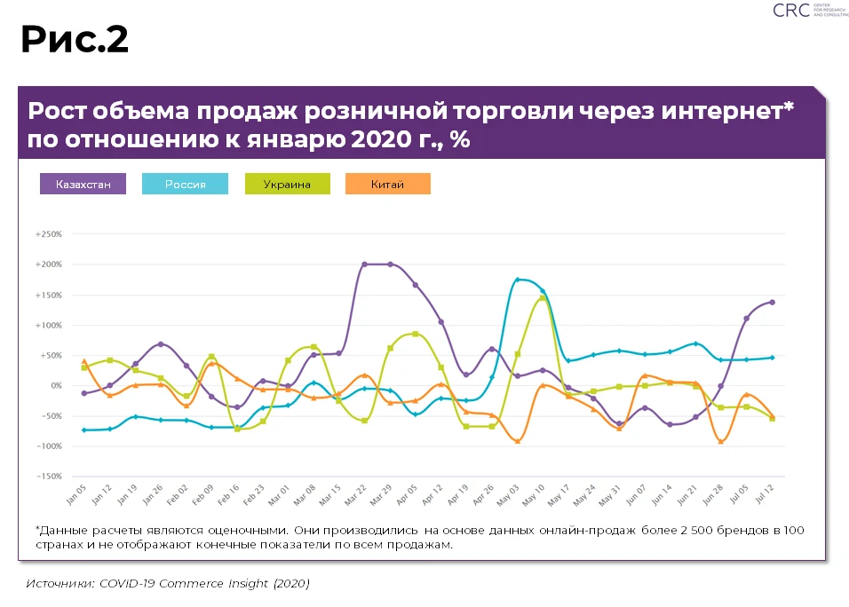 Рост популярности электронной торговли заметен и в Казахстане (Рис.2). По оценочным данным объемы продаж розничной торговли через интернет в стране выросли на 150% (к началу года).