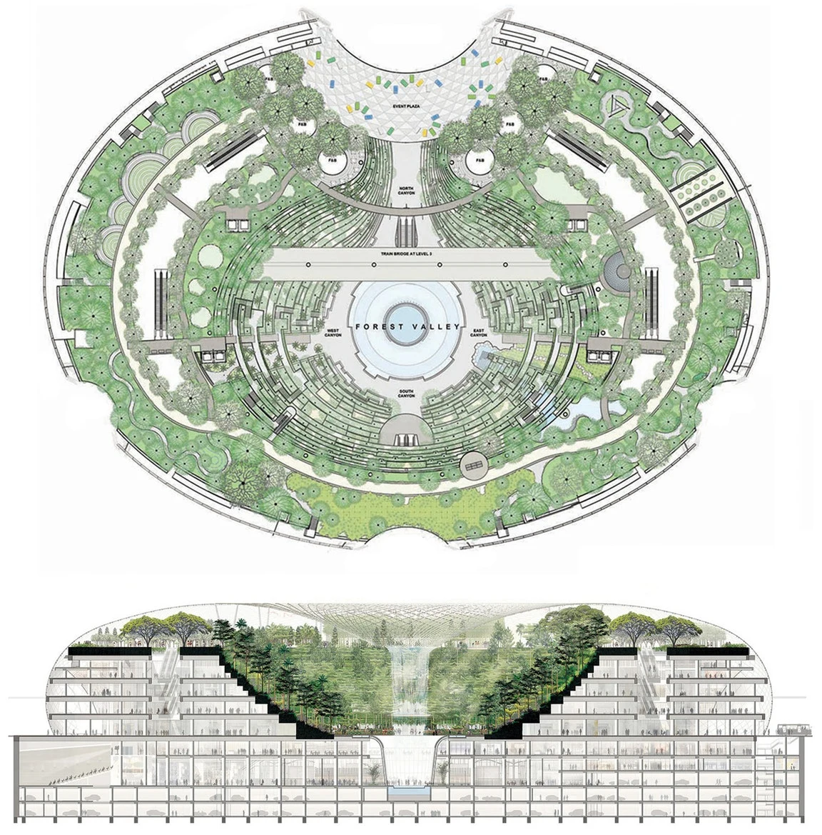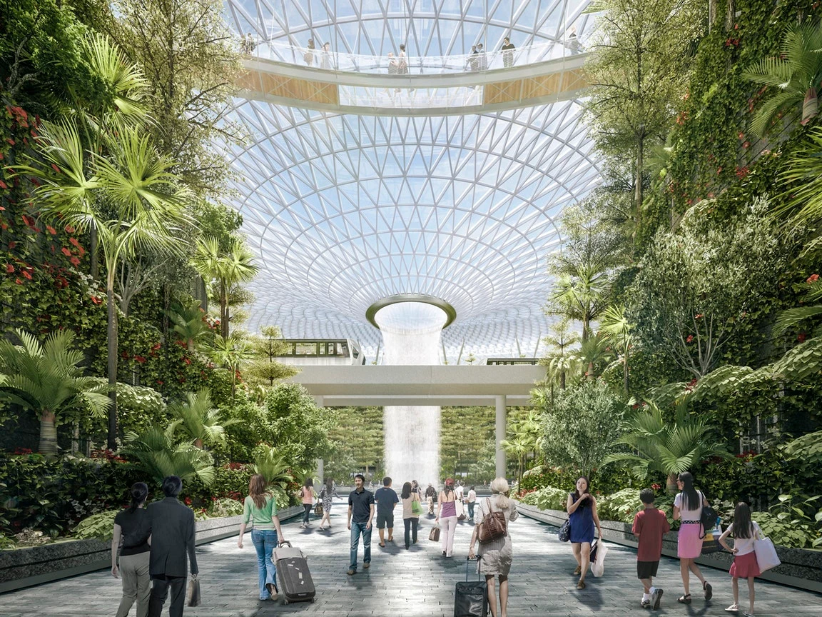Водопад будет изливаться на семь этажей вниз из стеклянной купольной крыши здания, спроектированного фирмой Safdie, которое планируется открыть 17 апреля 2019 года в Сингапурском аэропорту Чанги.