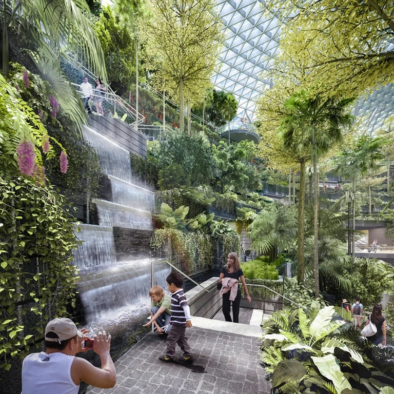 На окружающих водопад террасах высажены 200 видов растений. У посетителей есть возможность прогуляться по лесным тропинкам. Пять этажей здания Jewel Changi Airport будут заполнены магазинами и ресторанами, на самом верхнем уровне действует крытый парк.