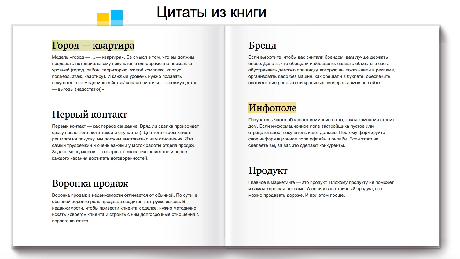 Известный российский маркетолог Игорь Манн с большим энтузиазмом взялся за решение актуальной проблемы. Недавно издательство «МИФ» опубликовало его книгу под названием «Та самая книга девелопера». В ней собраны ценные рекомендации, с помощью которых можно грамотно и выгодно осуществить продажу недвижимости.
