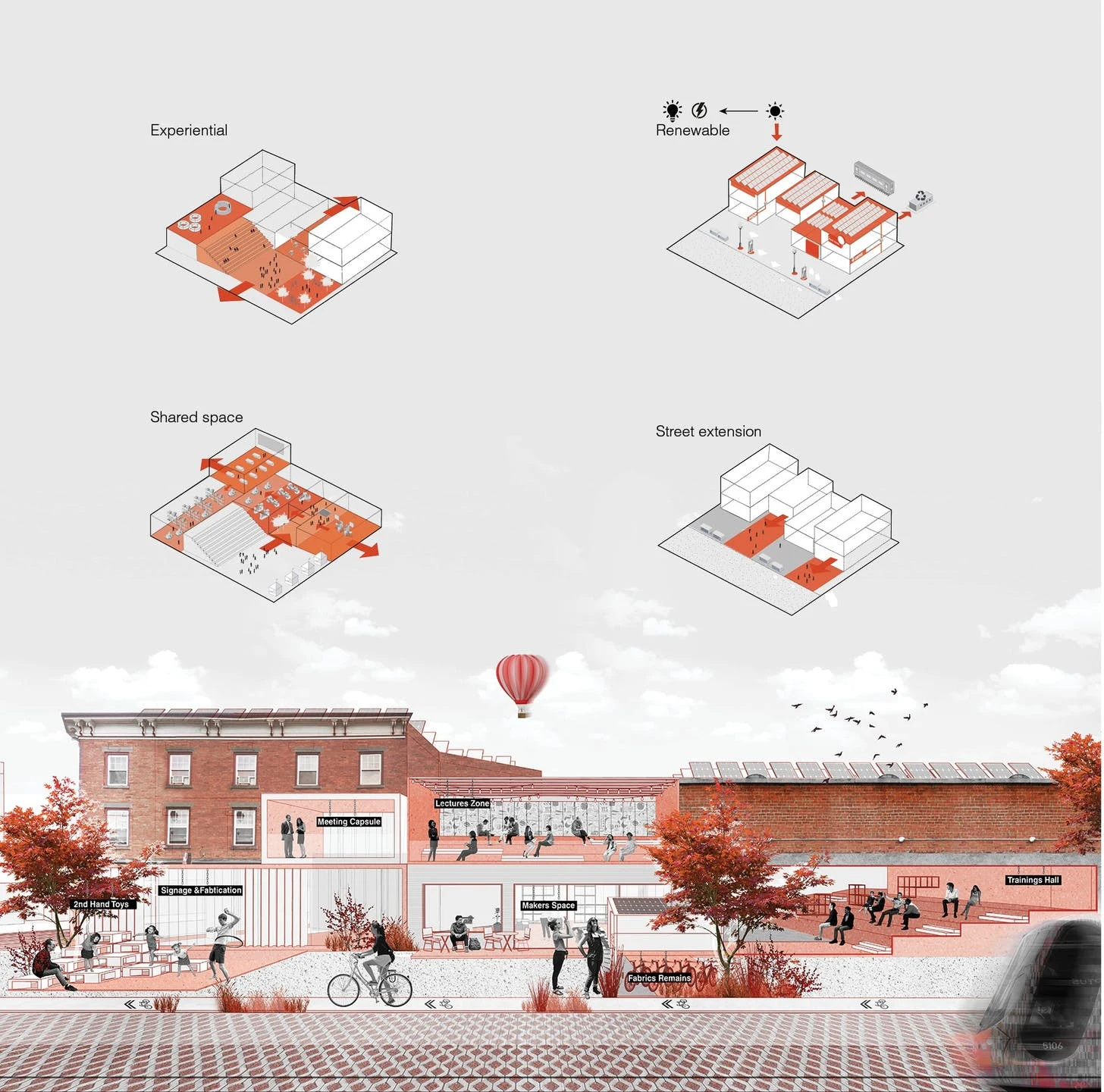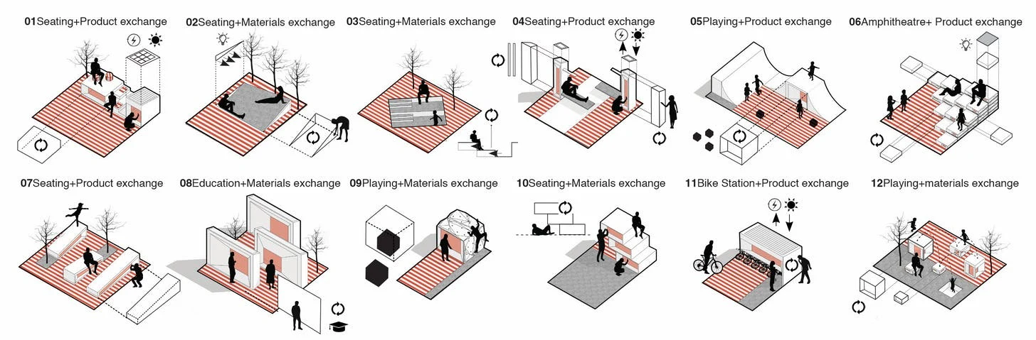 Такое совместное использование активов не только снижает затраты и выбросы углерода, но и направляет местную экономику, способствует взаимодействию, увеличивает количество рабочих мест, обеспечивает социальную справедливость и повышает социальную ответственность и осведомленность. Наш подход был направлен на активацию улиц путем расширения пешеходной дорожки и её активации с помощью совместных всплывающих элементов. Расширение уличных социальных сетей включает компоненты совместного потребления для повторного использования и обмена материалами и товарами в рамках Кооператива. Например, в текстильном кооперативе остатки ткани могут быть доступны для общественного пользования.