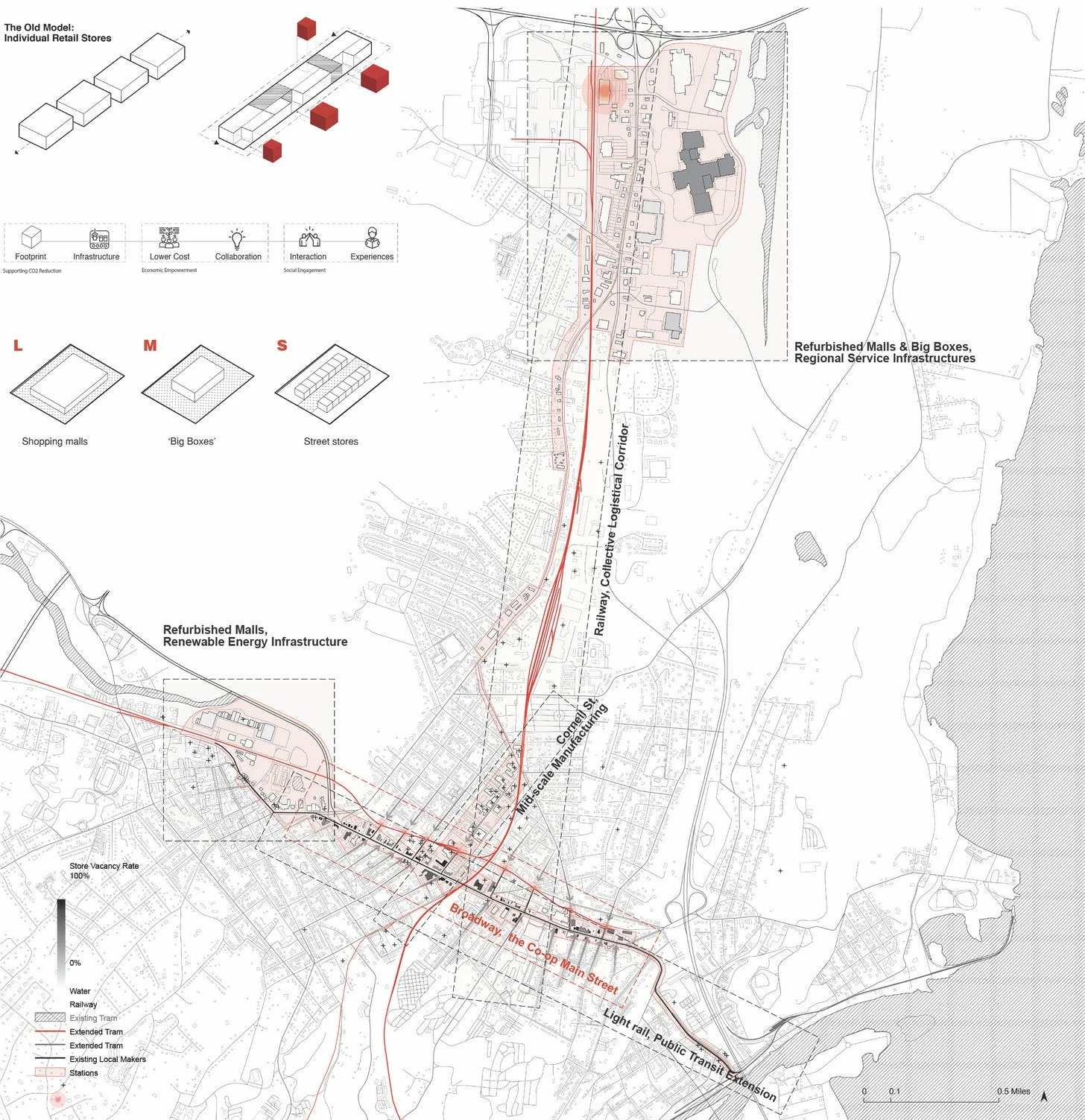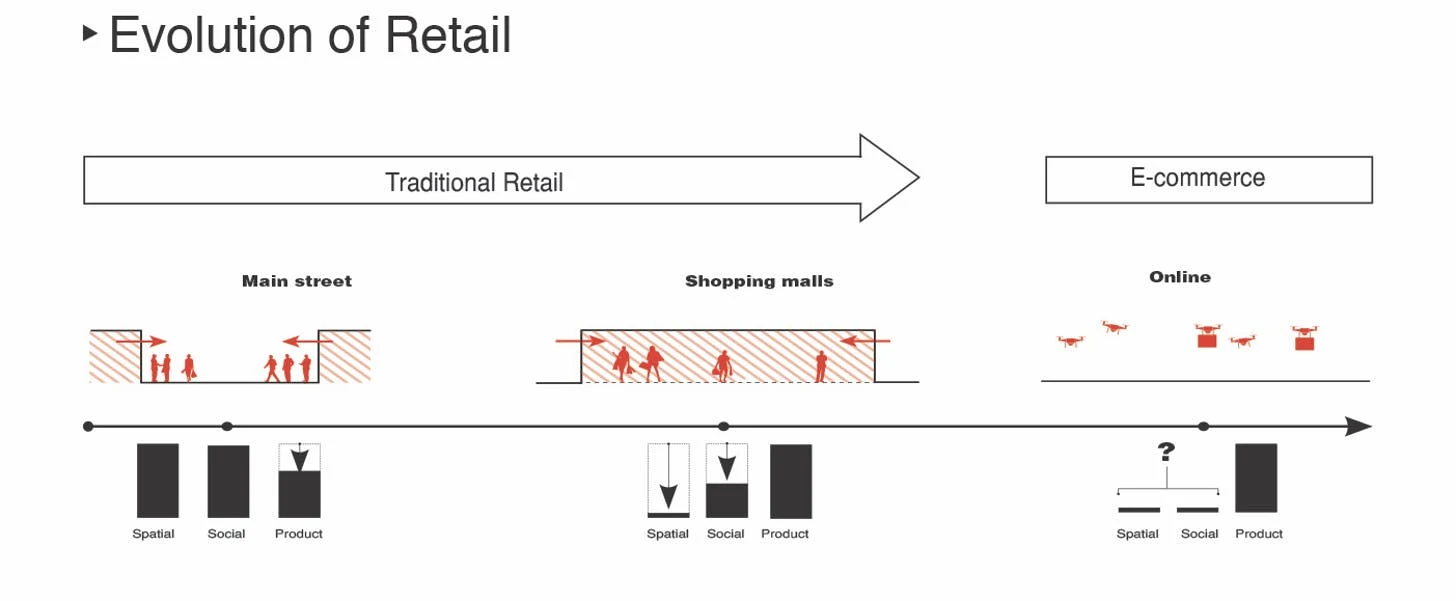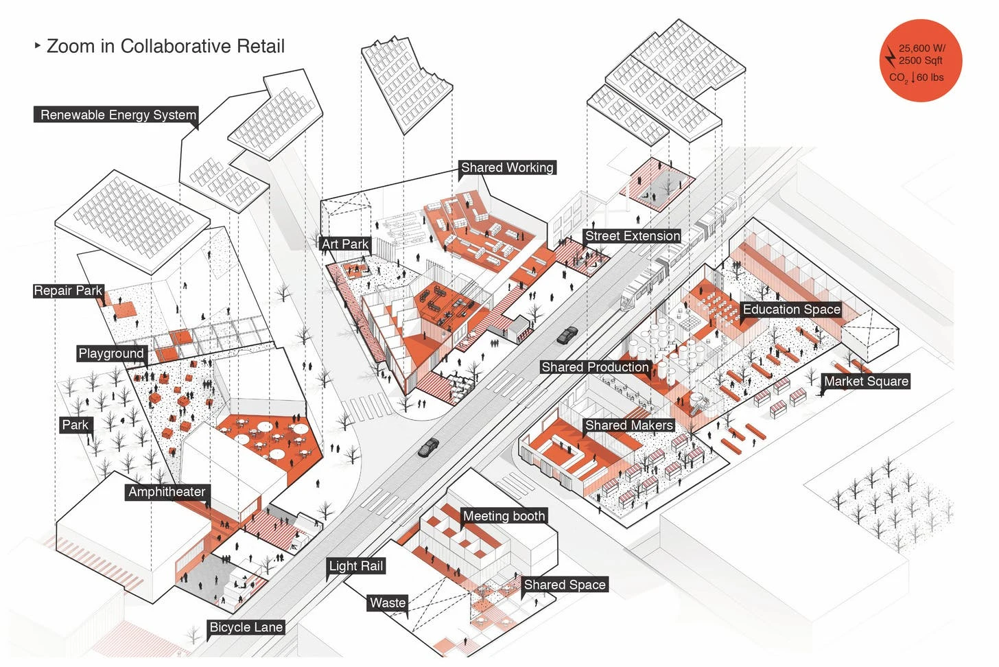 С глобальным переходом от традиционных покупок к электронной коммерции и изменением потребительских тенденций основная уличная розница, магазины Big Box и торговые центры, которые де-факто были социальным пространством для малых городов Америки, превратились в избыточную инфраструктуру. Последствия этого сильно повлияли на социальное взаимодействие, местную экономику, существующую инфраструктуру, рабочие места и услуги. Это дает возможность переопределить новый розничный модуль, который отталкивается от восходящего подхода через возрождение основных улиц и предоставляет потребителям опыт и осведомленность, а также создает общую платформу для сотрудничества для малых предприятий путем совместного использования пространства, энергии, ресурсов и управления отходами, и хранения.