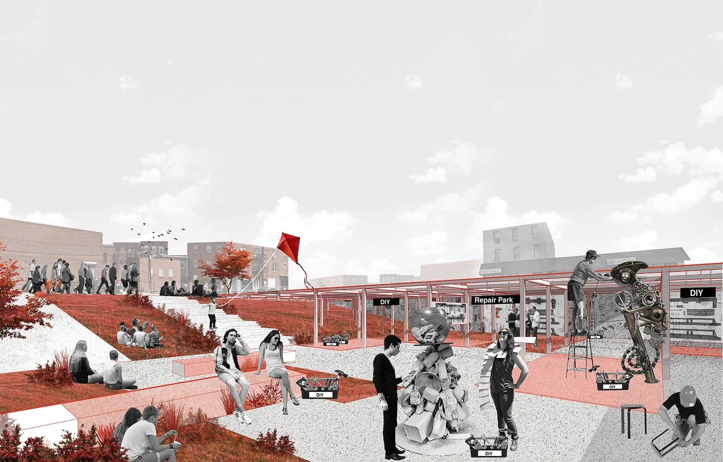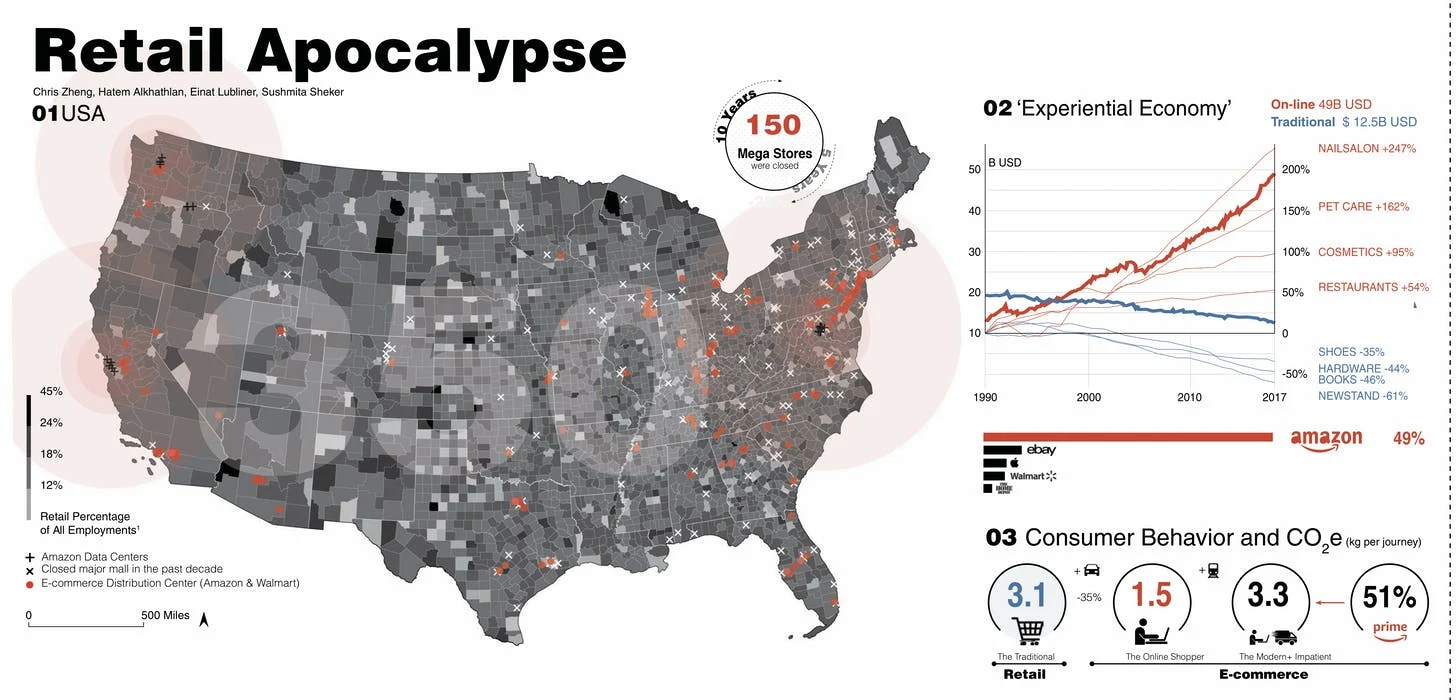 Недавние магистры архитектуры и городского дизайна (MSAUD), аспиранты Высшей Школы Архитектуры, Планирования и Сохранения Колумбийского Университета (GSAPP), стремятся пересмотреть модель розничной торговли с акцентом на малый бизнес и сообщества. Исследовательский проект под названием Post Retail Apocalypse, инициированный Эйнатом Люблинером, Сушмитой Шекар, Хатемом Алхатланом и Крисом Чжэном, исследует новый подход к повторному использованию больших коробочных магазинов путем внедрения дизайнерских решений, которые способствуют «социальному взаимодействию и справедливости».