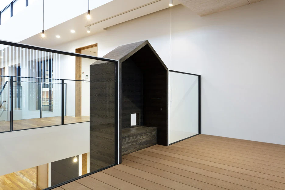 В хижине есть небольшое окно, и оно создает новую связь с детьми, которые играют внизу. Стеклянные балюстрады на верхнем этаже предназначены для того, чтобы дети и учителя могли видеть друг друга и здание целиком.