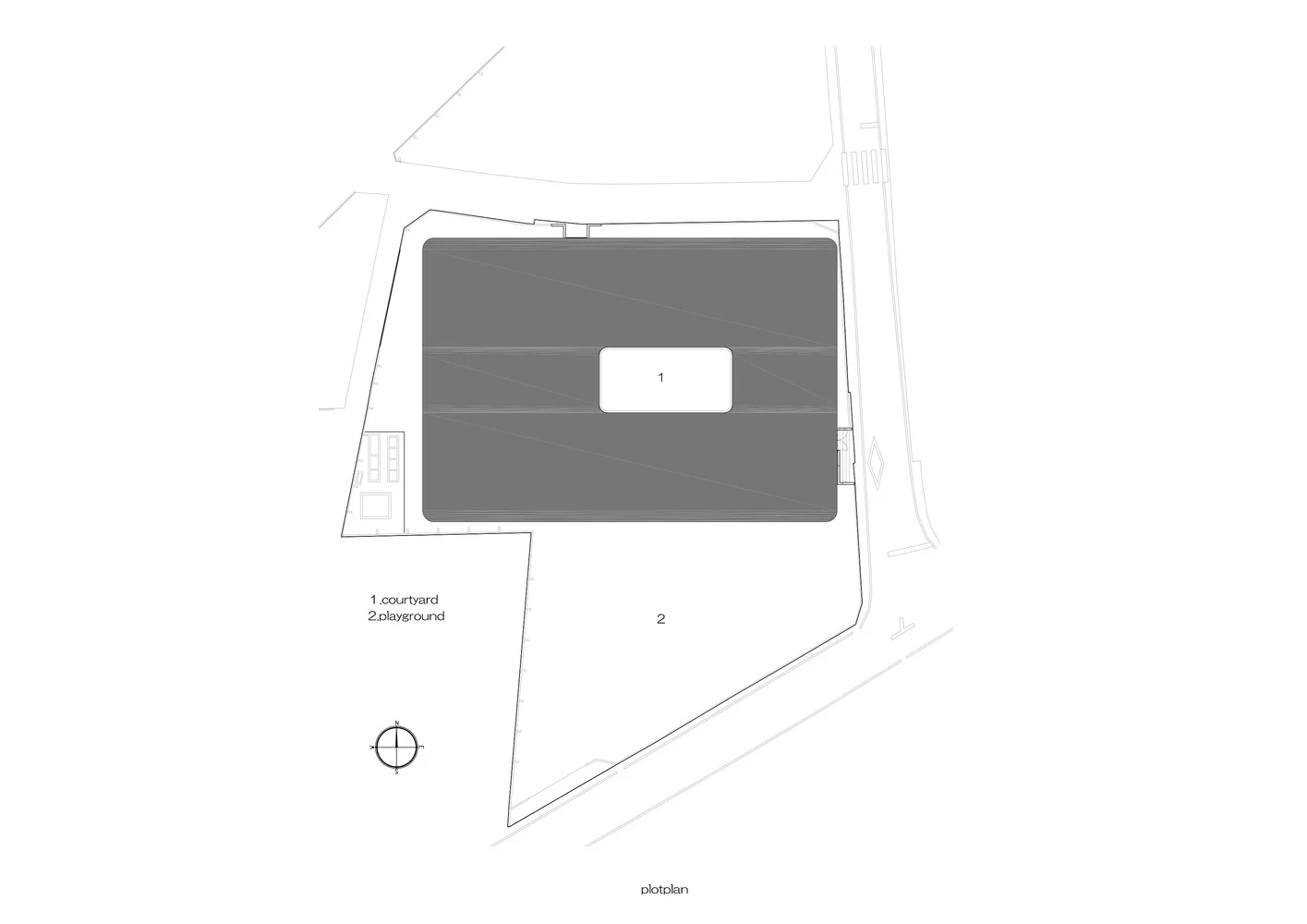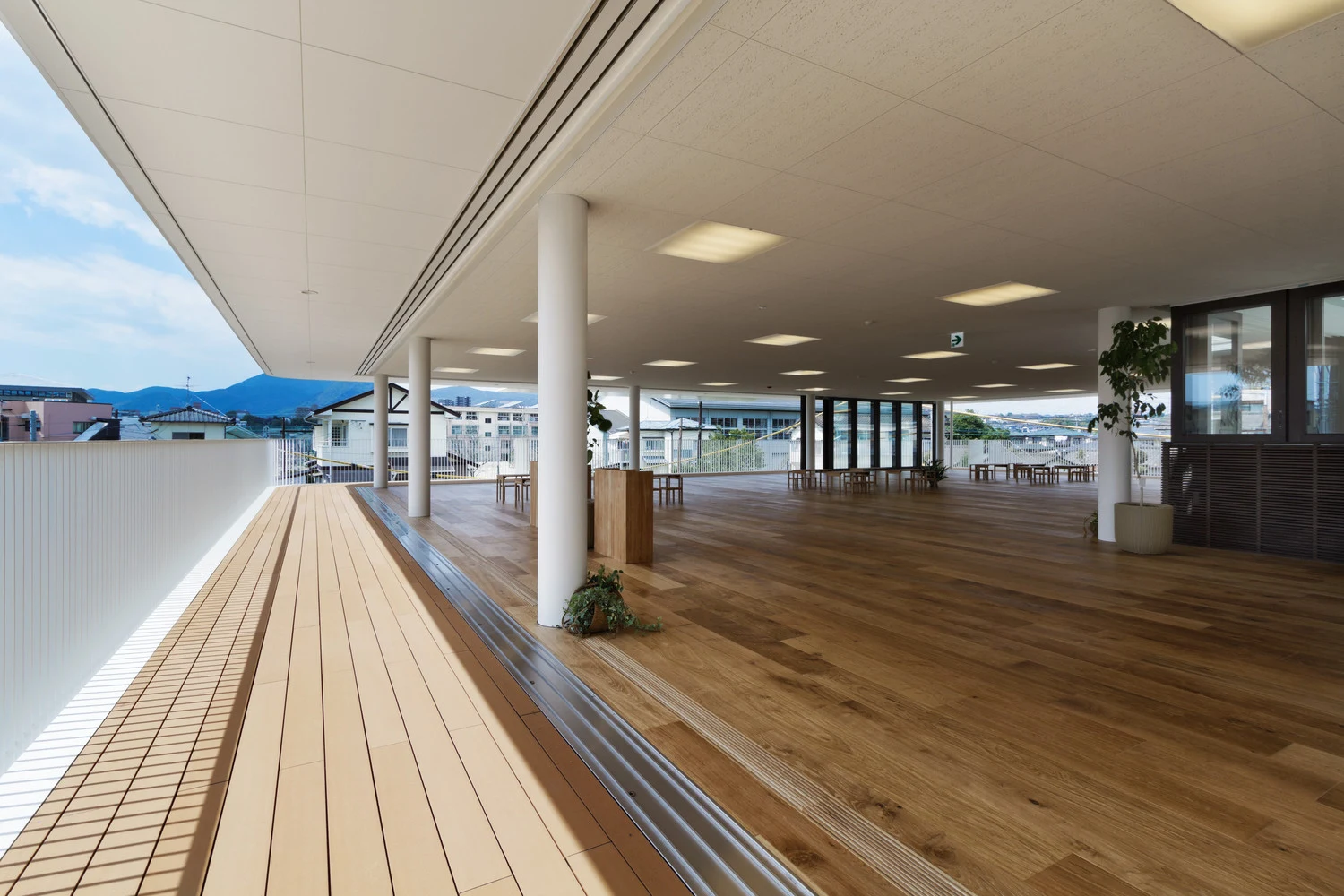 Двор школы предназначен для сбора дождевой воды, так что после сильного ливня создается внушительная лужа, в которую с радостью ожидают дети. Хибино Секкей разработали двор таким образом, чтобы в сухие дни он мог функционировать как площадка для бадминтона или софтбола, а зимой его можно даже превратить в ледовый каток.